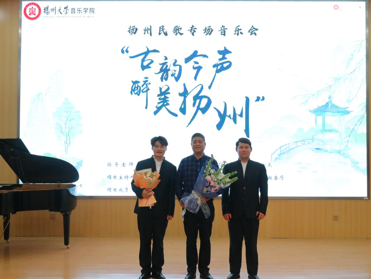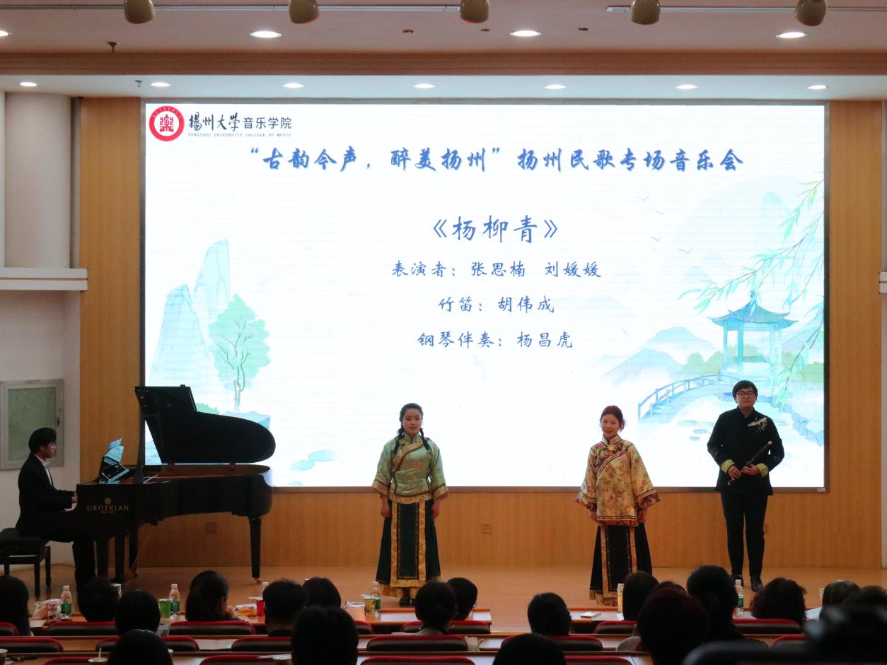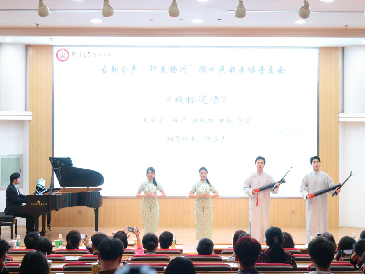 On April 10th, 2024, at 7:00 PM, organized by the College of Music of Yangzhou University, “Ancient Rhyme, Modern Sound, and Beautiful Yangzhou” Yangzhou folk song concert (2023 Innovation and Entrepreneurship training program for college students in Jiangsu Province, “Inheritance and Protection of Suzhou and Chinese Dialects in Singing Language - Taking Yangzhou Dialect as an example” stage results) was successfully held in the lecture Hall of Yifu Library, Hehuachi Campus, Yangzhou University.