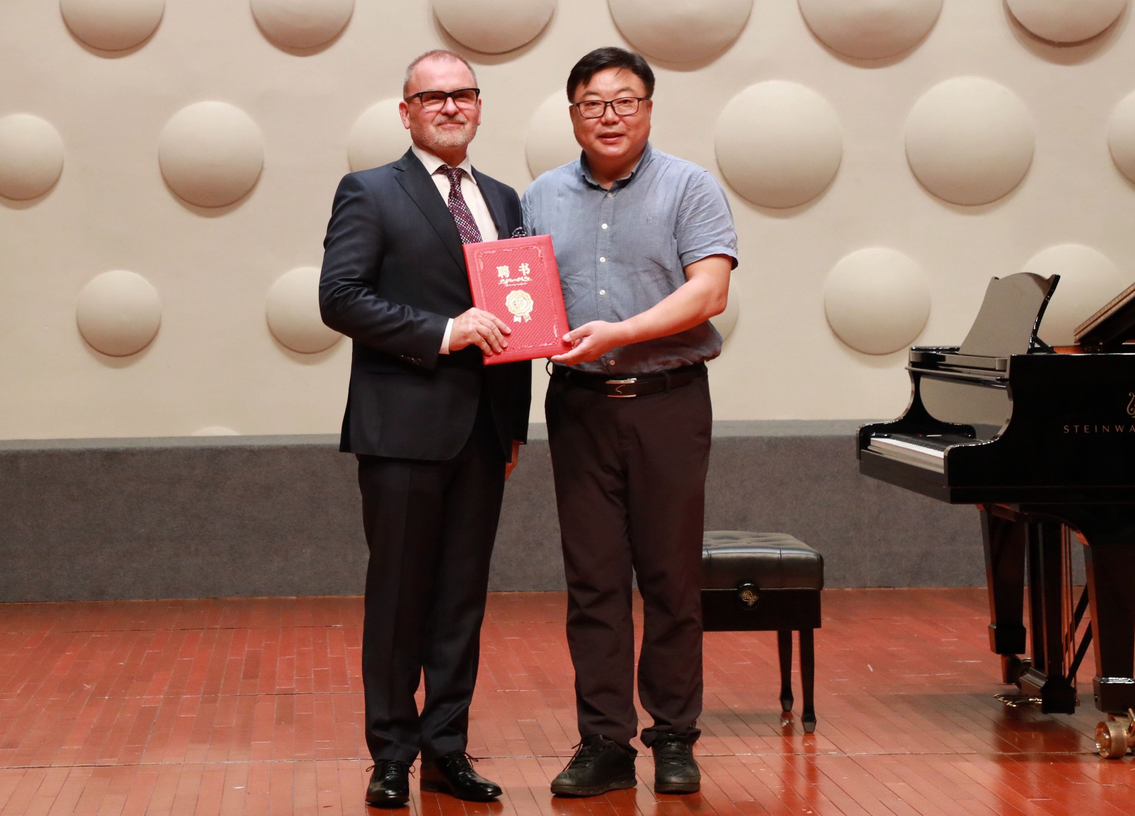 Before the concert, the college held a ceremony for the appointment of adjunct professors, and hired Professor Artur Stefanovicz, a high tenor singer, professor of Chopin University of Music in Poland and doctoral supervisor, as an adjunct professor of the College of Music. The secretary of the Party committee of the college, Fang Dongsheng, issued a letter of appointment to Professor Artur Stefanovicz. On behalf of the College, Fang Dongsheng welcomed the arrival of Professor Artur Stefanovicz and his group. He hoped that the two universities will strengthen cooperation in the cultivation of music talents, discipline construction and international exchanges to help the high-quality development of the music discipline.