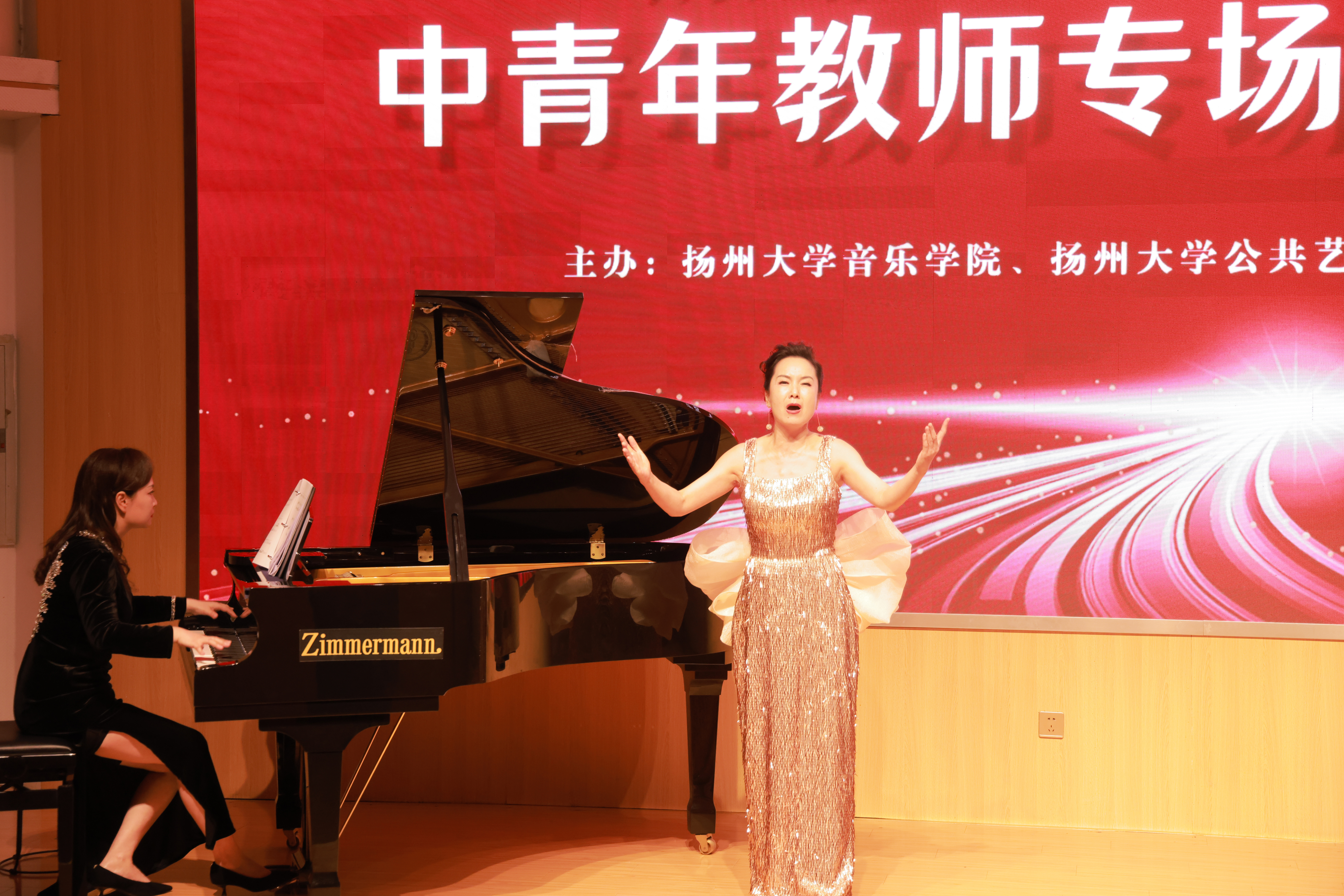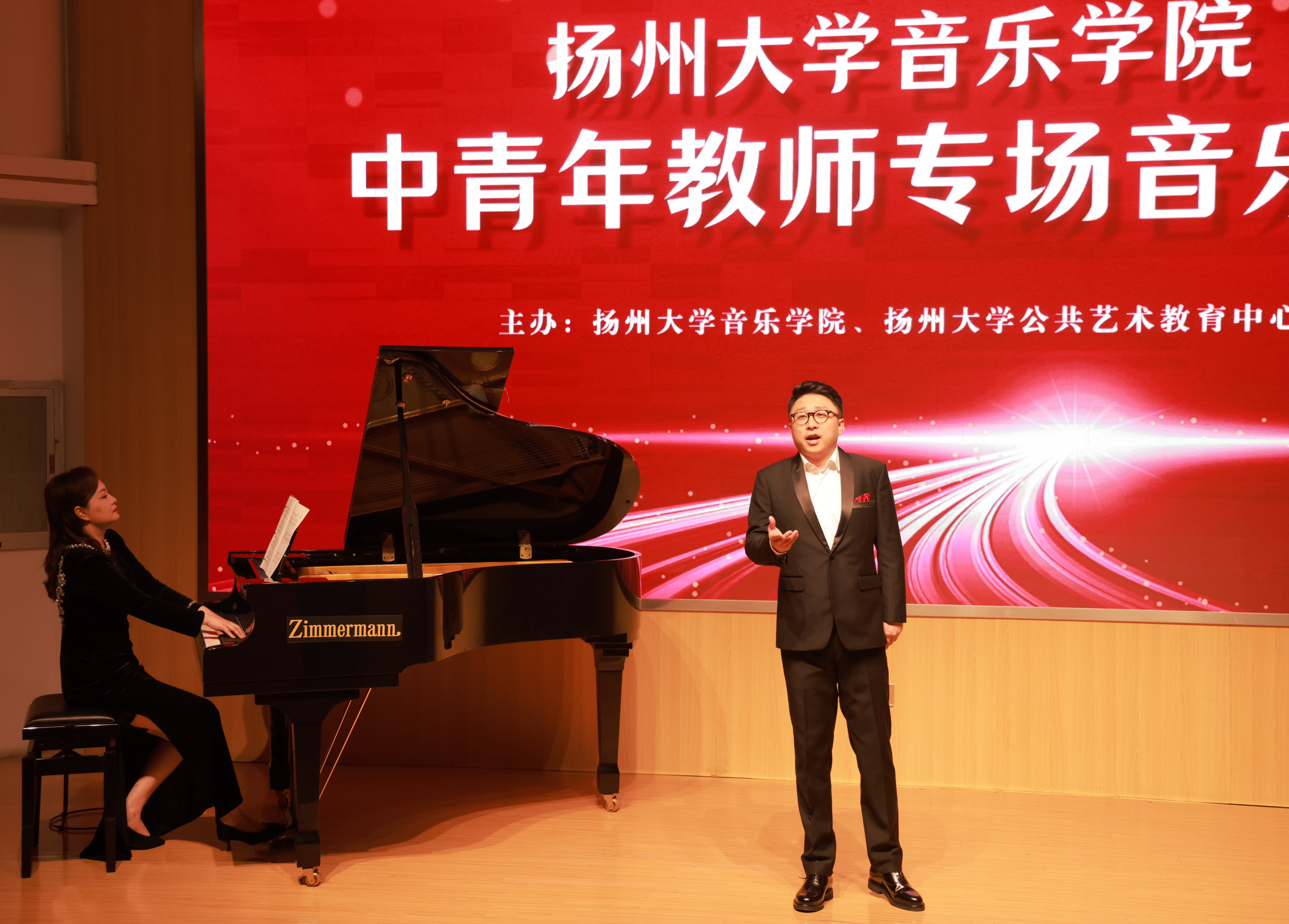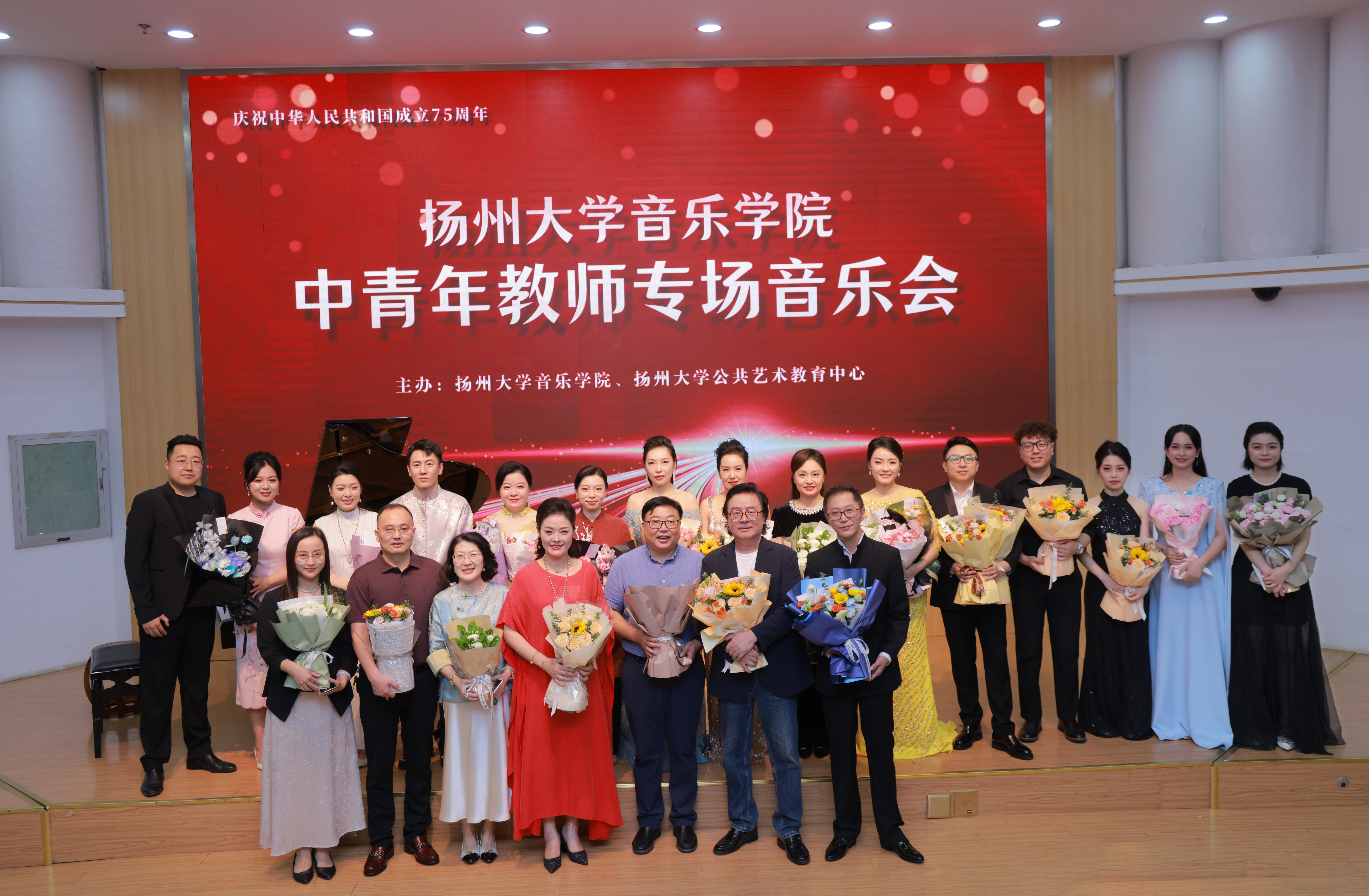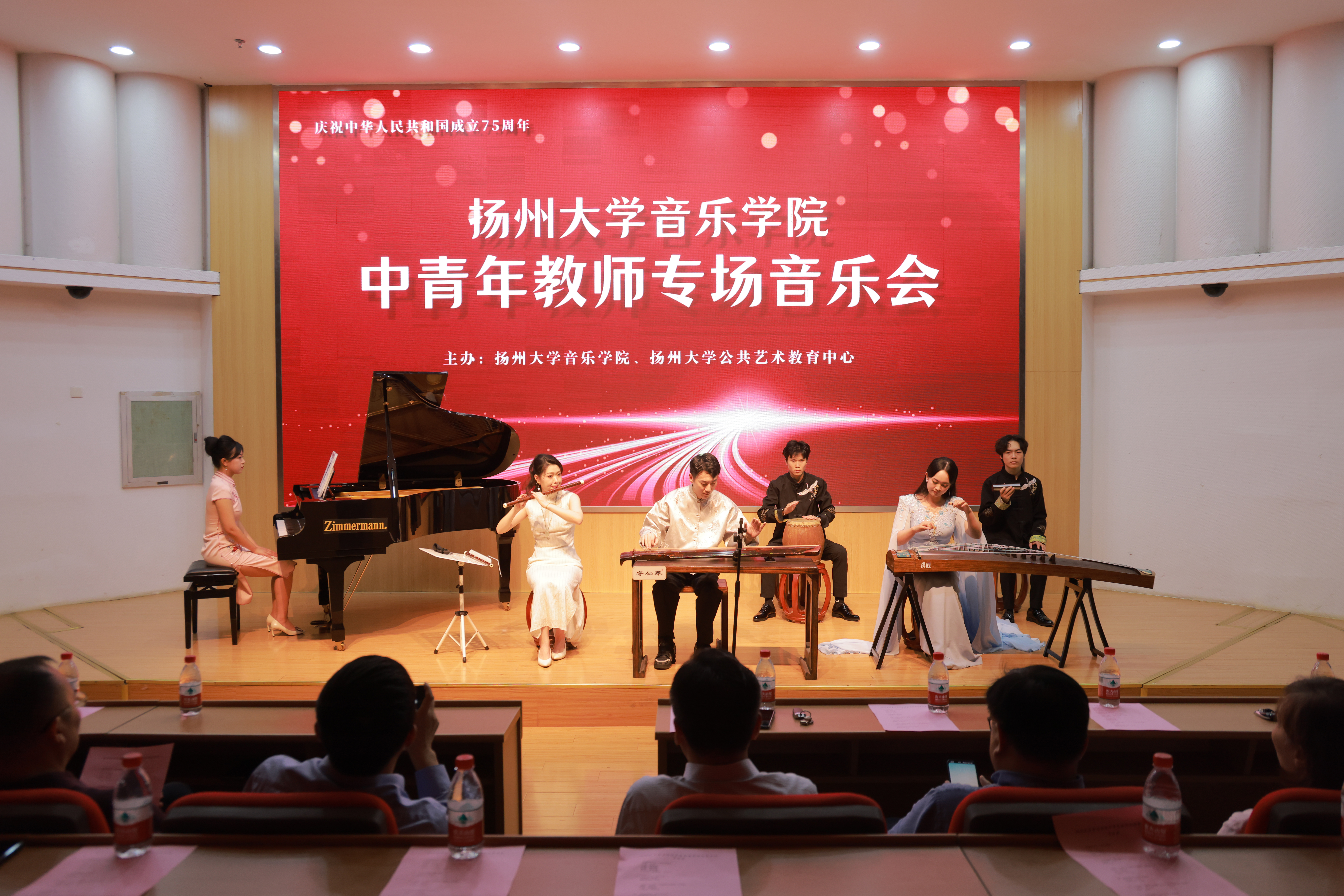 At 7 PM on September 28, 2024, a special concert by young and middle-aged teachers sponsored by the College of Music and the Public Art Education Center of Yangzhou University was successfully held in the lecture Hall of Yifu Library. Zhou Rujun, Deputy Secretary of the Party Committee of Yangzhou University, Zhang Xinhua, Standing Committee Member of the Party Committee and Minister of the Propaganda Department of Yangzhou University, Shen Yiwen, Secretary of the Party Committee of the College of Journalism and Media of Yangzhou University, as well as the leadership team of the College of Music and representatives of teachers and students attended the concert. Before the concert began, the secretary of the Party Committee of the College of Music, Fang Dongsheng, delivered an enthusiastic speech.