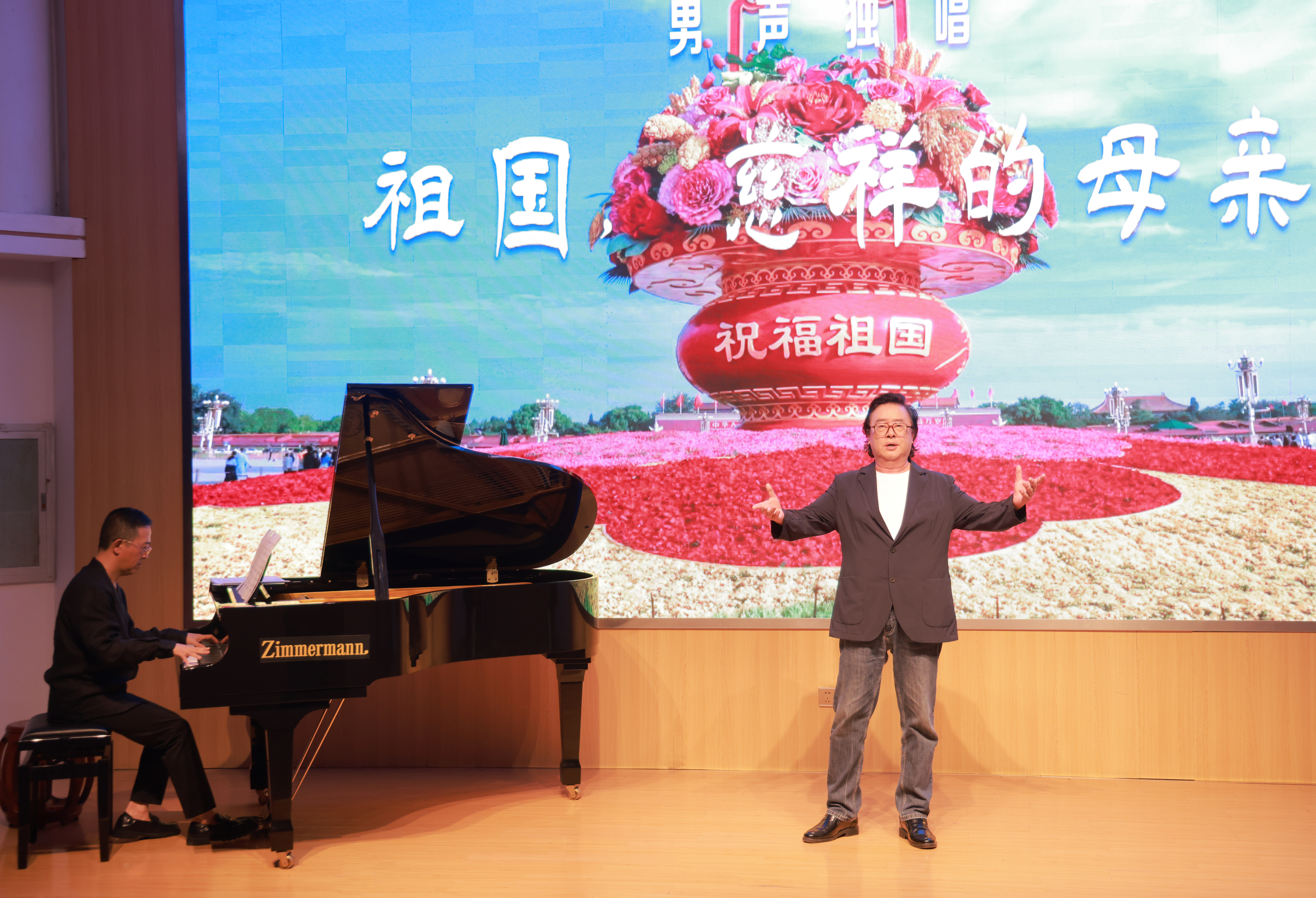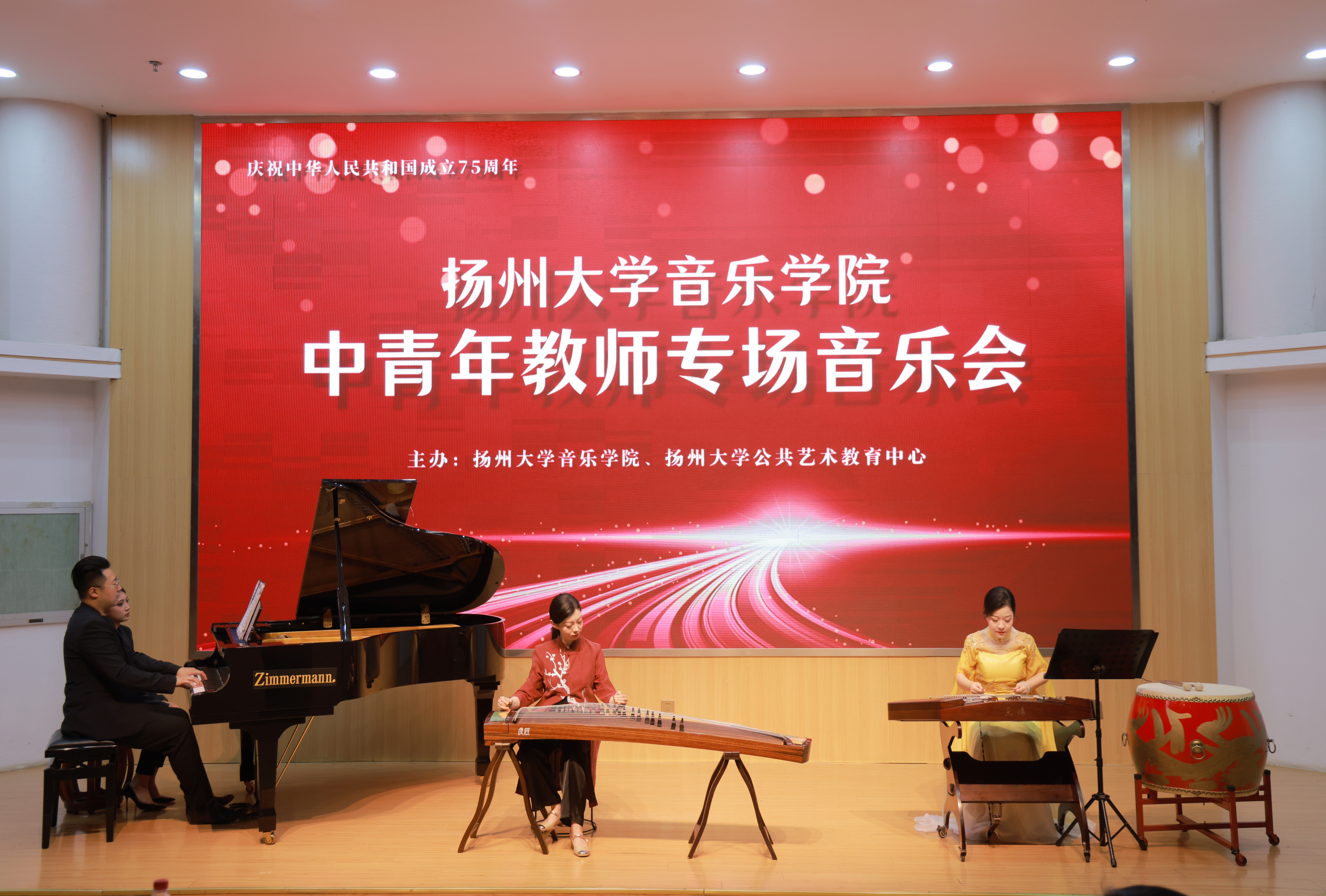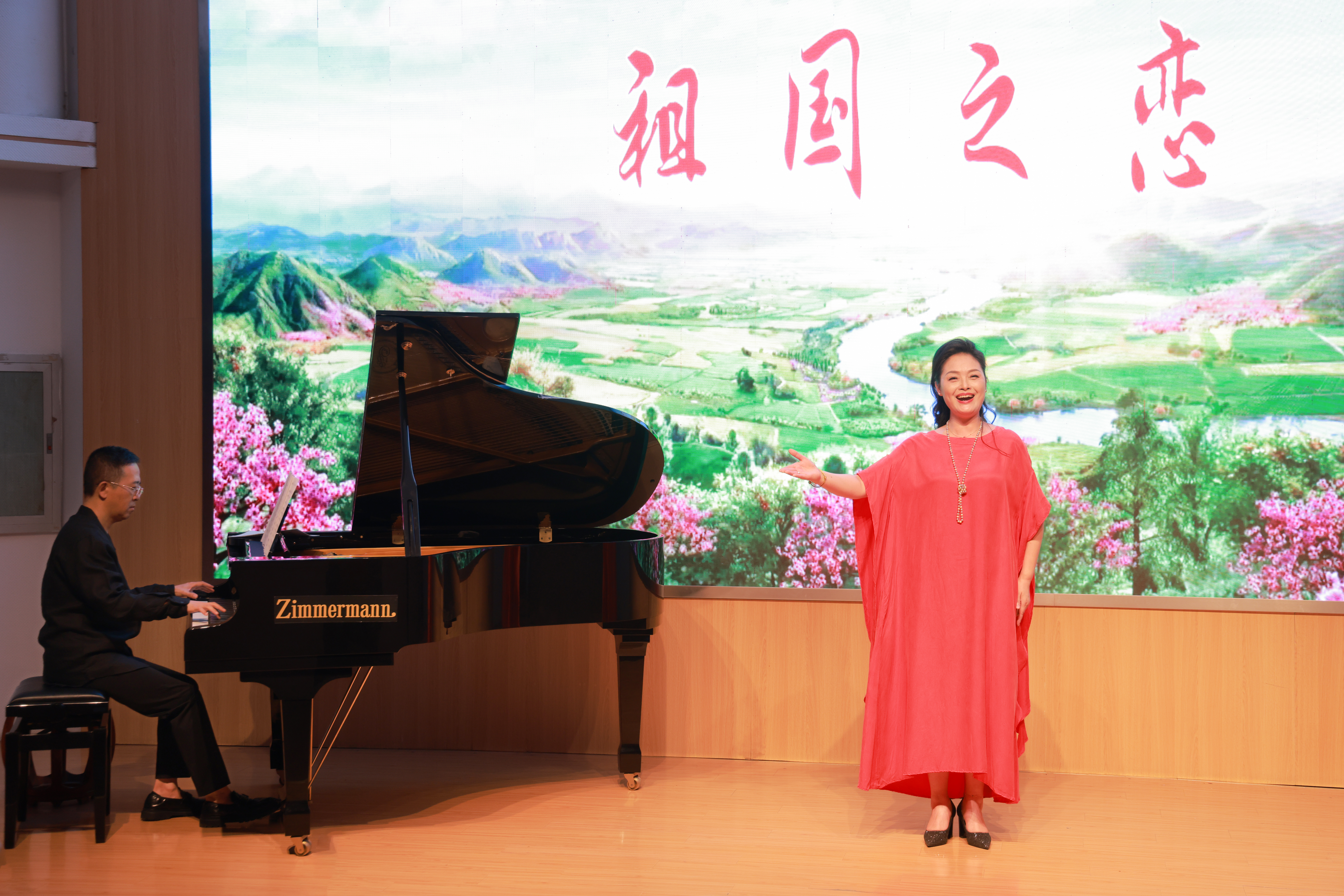 There are 11 pieces in the concert. There are Guqin teacher Jiang He, Guzheng teacher Chen Kejing, Bamboo flute teacher Sun Feiyi, piano teacher Fan Zhuoying played the national chamber music “Plum Blossom New Lane”(梅花新弄); Teacher Zhang Yan’s female vocal solo “Youlan Cao”(幽兰操); Piano teacher Tao Siyan, Trumpet teacher Li Qiwei, Cello teacher Wu Danqing’s cooperation trio “Wish”(如愿); Teacher Xia Yan’s male vocal solo “That is impossible”; The duet “Introduction and Polonaise Brillante Op.3” by cello teacher Wu Danqing and piano teacher Xu Jing; Teacher Gao Jie’s female vocal solo “Birds singing in the wind”; Teacher Lin Yan’s pipa solo “Overlord Armor Removal”(霸王卸甲); Yao Ting’s male solo singing “My motherland Mother”(我的祖国妈妈); Piano teacher Fu Long, Guzheng teacher Cheng Li, Dulcimer teacher Qian Yang’s cooperation trio “Love the Spring Breeze”(恋春风); Shao Ping’s female solo singing “Love of the Motherland”(祖国之恋); Zhang Meilin’s male solo singing “Motherland, kind mother” (祖国,慈祥的母亲).