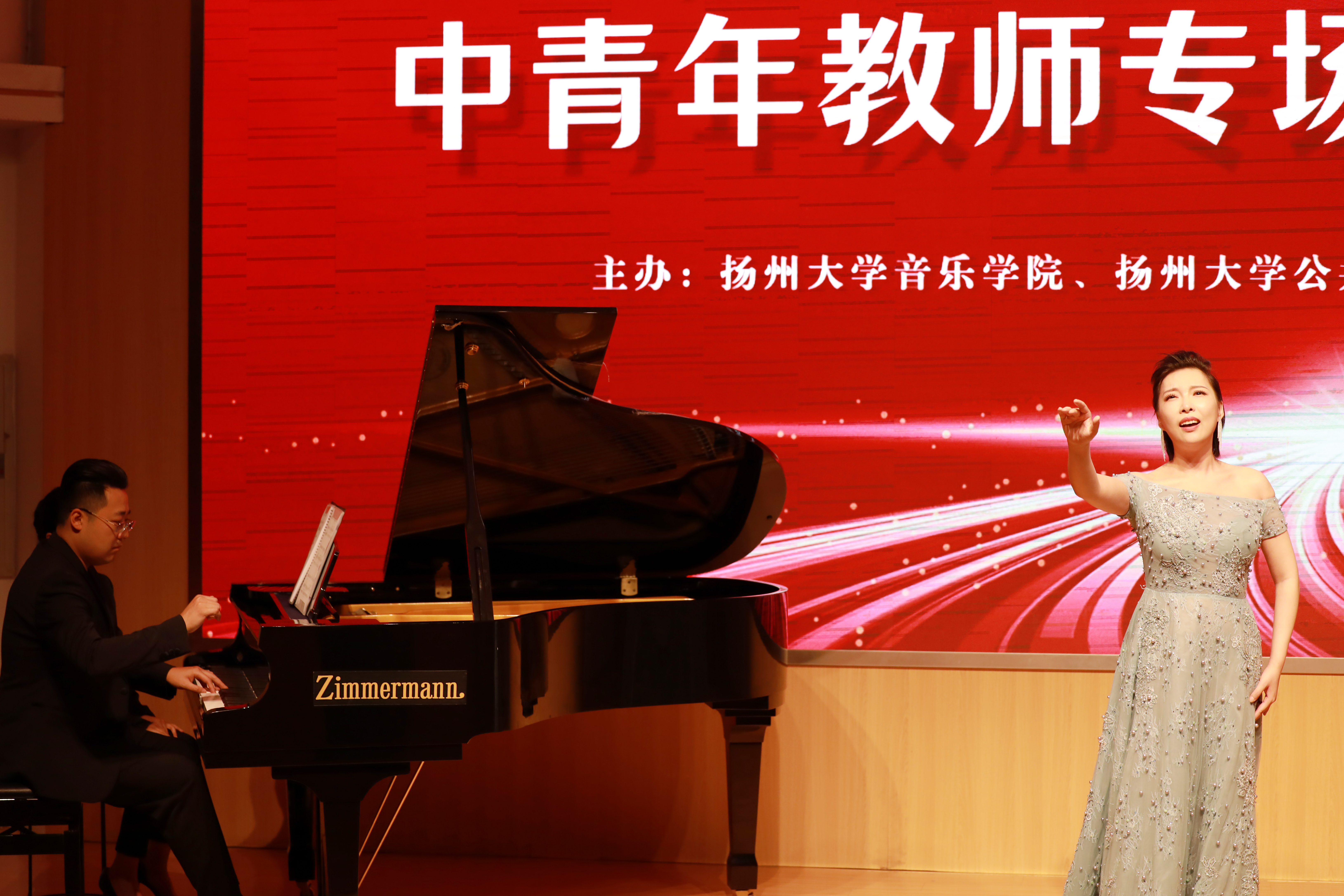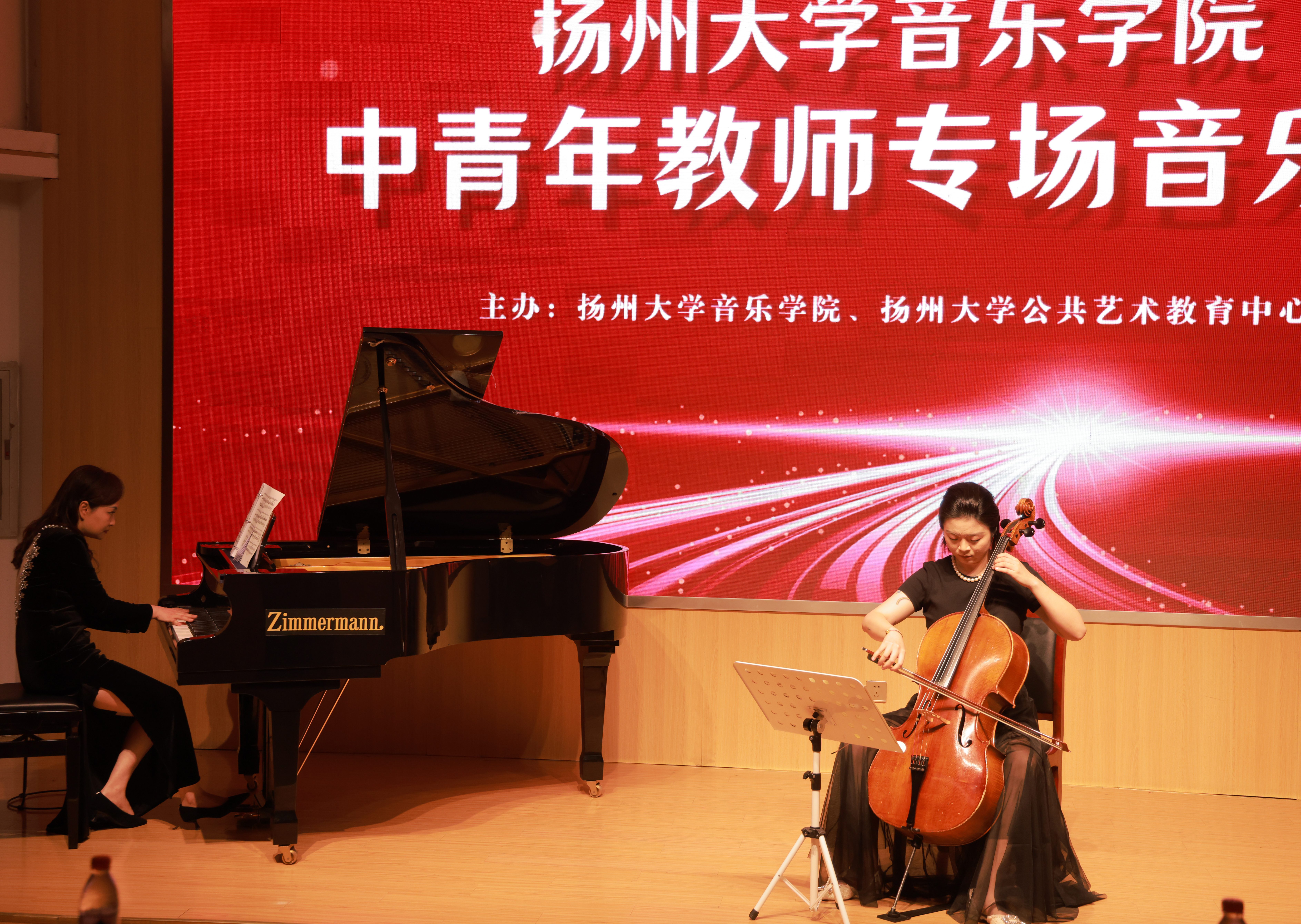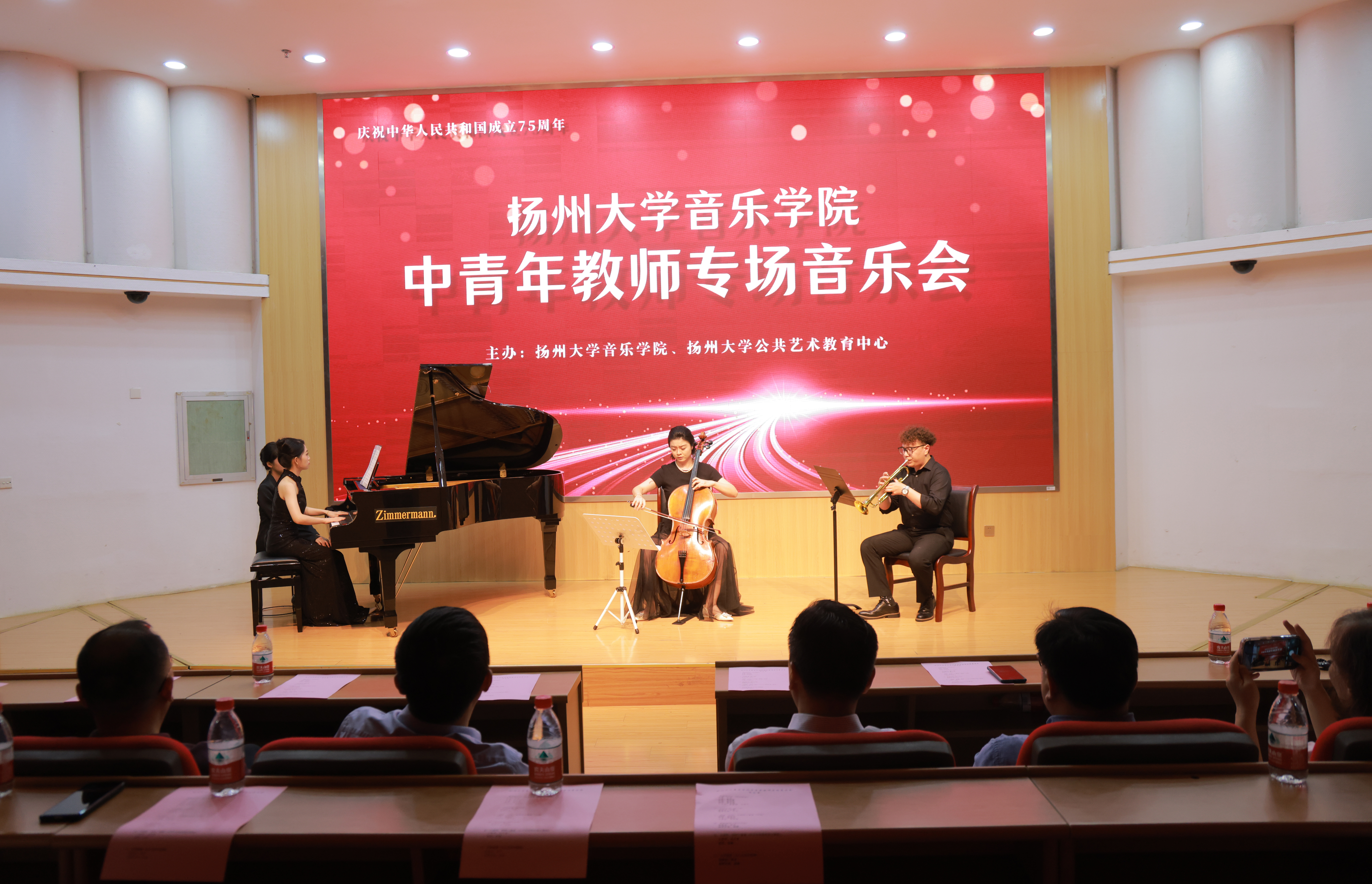 There are 11 pieces in the concert. There are Guqin teacher Jiang He, Guzheng teacher Chen Kejing, Bamboo flute teacher Sun Feiyi, piano teacher Fan Zhuoying played the national chamber music “Plum Blossom New Lane”(梅花新弄); Teacher Zhang Yan’s female vocal solo “Youlan Cao”(幽兰操); Piano teacher Tao Siyan, Trumpet teacher Li Qiwei, Cello teacher Wu Danqing’s cooperation trio “Wish”(如愿); Teacher Xia Yan’s male vocal solo “That is impossible”; The duet “Introduction and Polonaise Brillante Op.3” by cello teacher Wu Danqing and piano teacher Xu Jing; Teacher Gao Jie’s female vocal solo “Birds singing in the wind”; Teacher Lin Yan’s pipa solo “Overlord Armor Removal”(霸王卸甲); Yao Ting’s male solo singing “My motherland Mother”(我的祖国妈妈); Piano teacher Fu Long, Guzheng teacher Cheng Li, Dulcimer teacher Qian Yang’s cooperation trio “Love the Spring Breeze”(恋春风); Shao Ping’s female solo singing “Love of the Motherland”(祖国之恋); Zhang Meilin’s male solo singing “Motherland, kind mother” (祖国,慈祥的母亲).