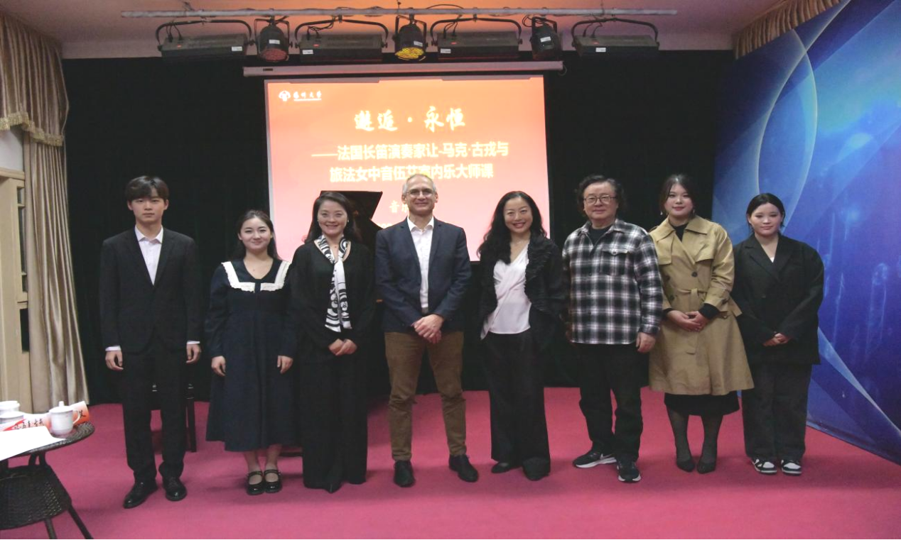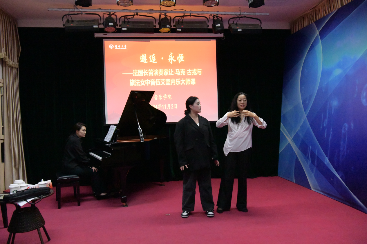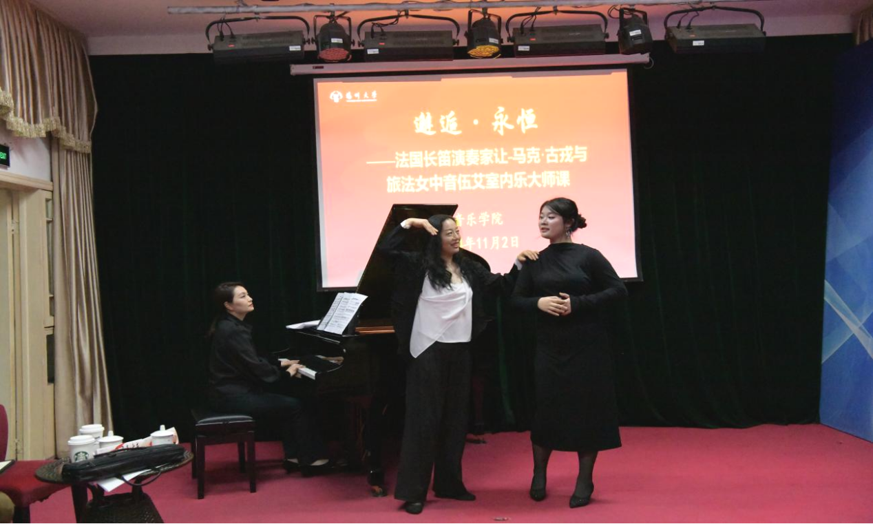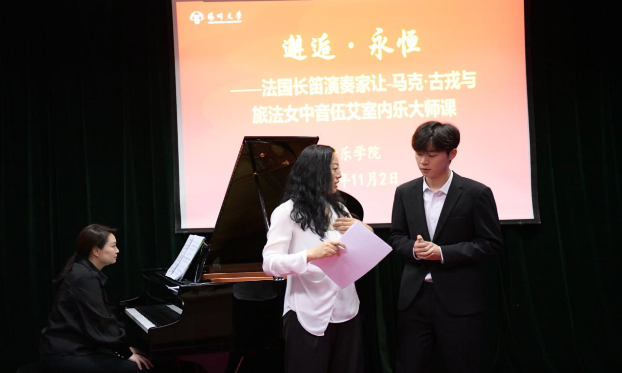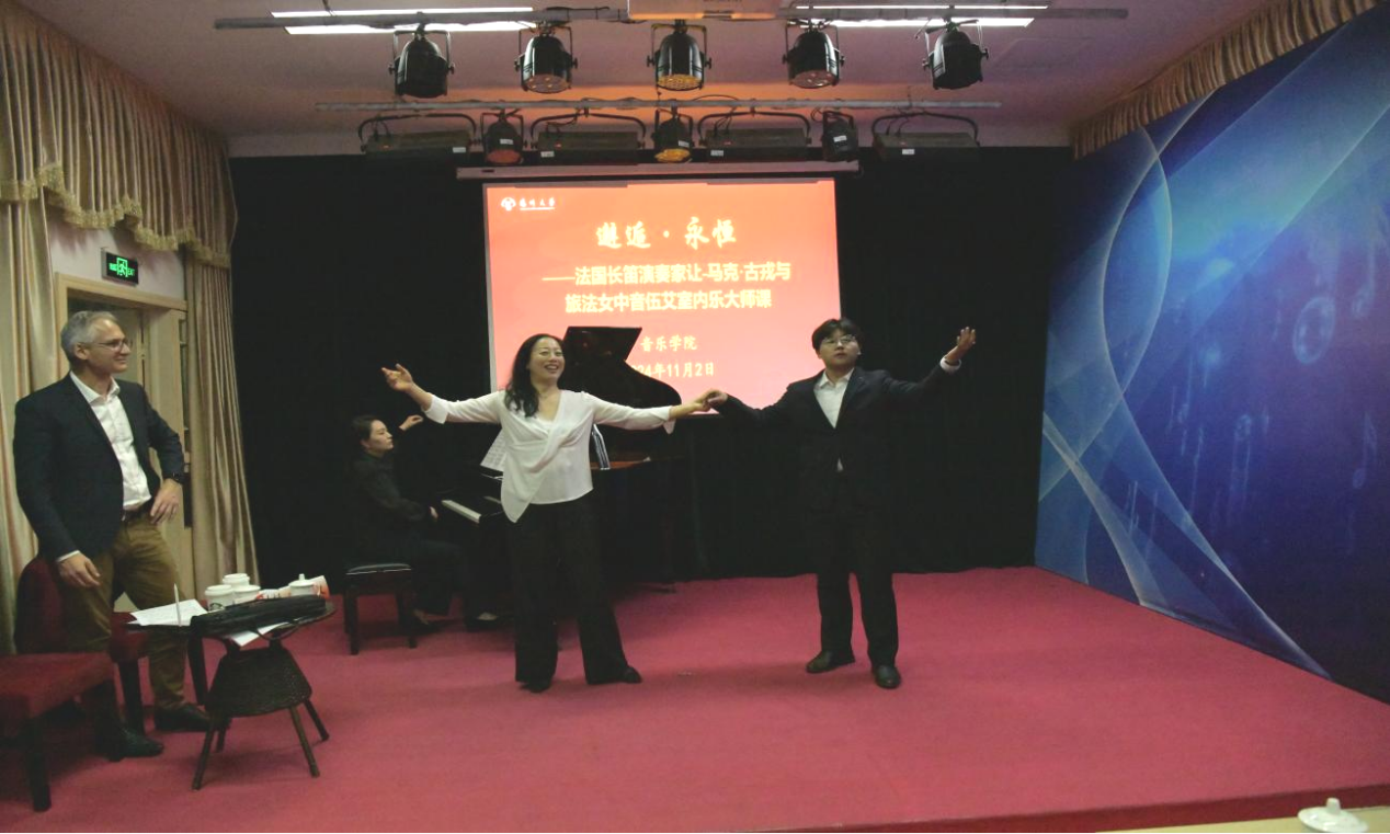 To further enhance the vocal skills and comprehensive development of the college's students, college of music held a masterclass on the afternoon of November 2nd in the Mingyue Music Hall. Renowned French flutist Jean-Marc Goujon and mezzo-soprano Wu Ai were invited to hold the masterclasses. Zhang Meilin, the founding dean of the music college; Dean Shao Ping; Vice Dean Yao Ting; Director of the Vocal Department Xia Yan; and representatives of faculty and students attend the masterclasses.