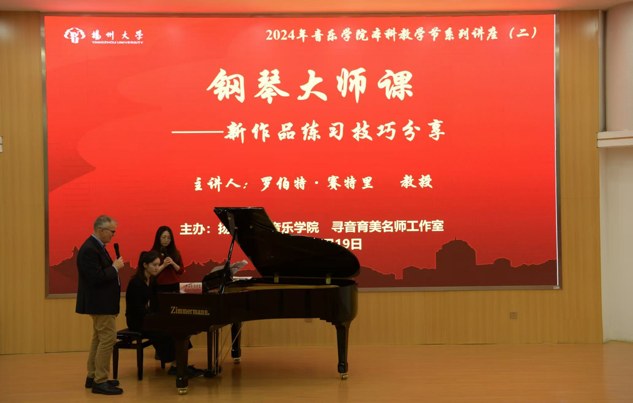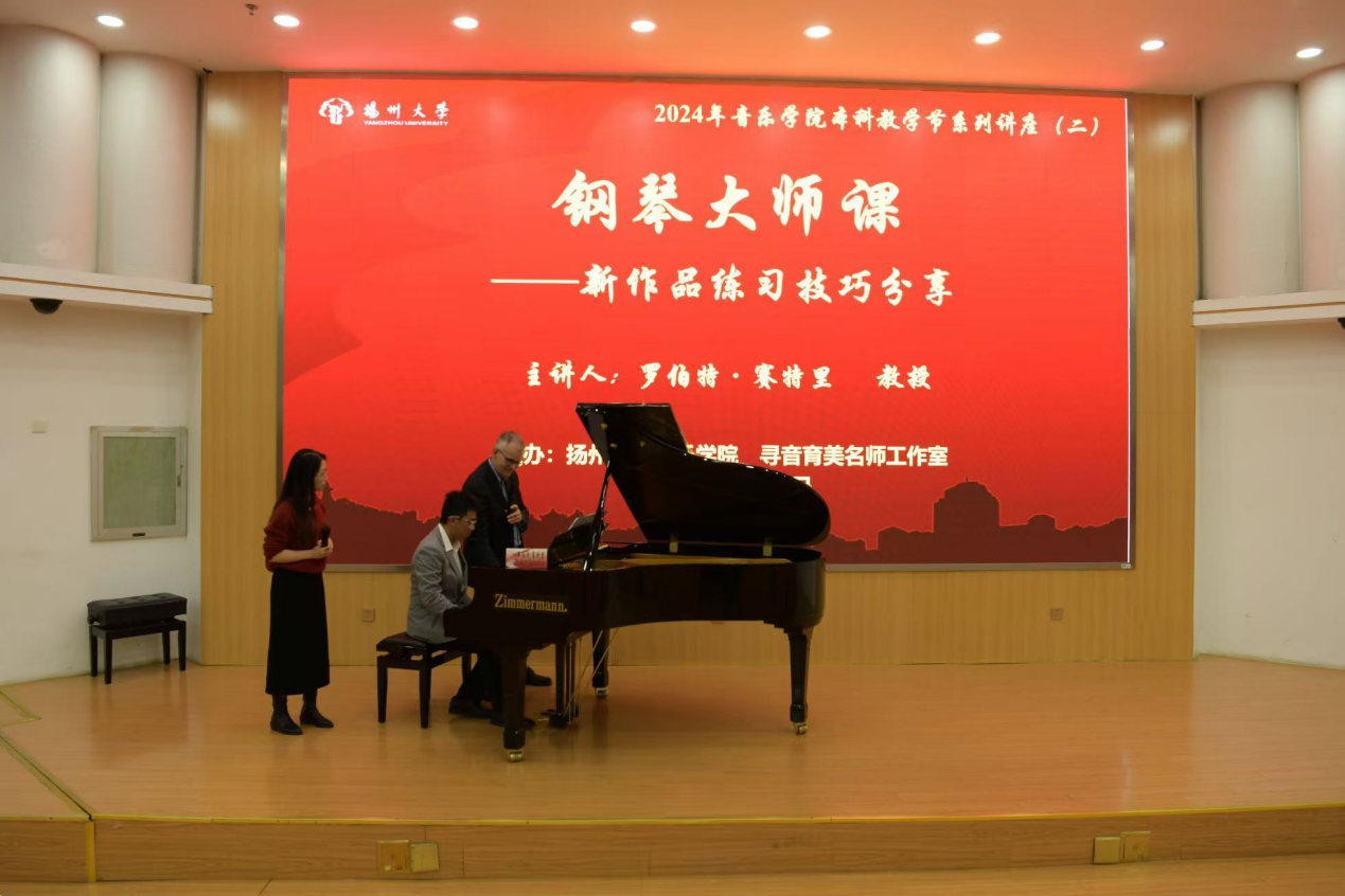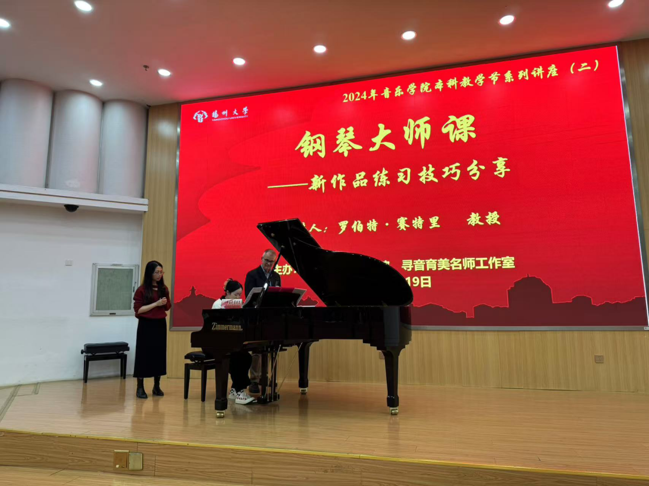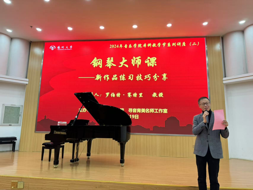 To cultivate and enhance students' professional skills, the College of Music at Yangzhou University held the second session of the 2024 Undergraduate Teaching Festival Lecture Series on the afternoon of November 19, 2024. The event, titled "Piano Masterclass – Practice Techniques for Learning a New Piece of Music," took place in the Lecture Hall of the Yifu Building on the Hehuachi Campus.