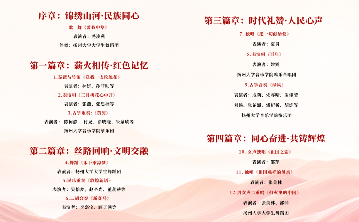 On the evening of November 12, 2025, a magnificent art gala blending ethnic charm, revolutionary legacy, and the spirit of the times was presented at Yangzhou Polytechnic Institute. The faculty and students from the School of Music, Yangzhou University presented their meticulously curated program Splendid Rivers and Mountains · Ethnic Unity, offering the audience an artistic immersion that allowed the flower of fine art to bloom vibrantly across the campus.