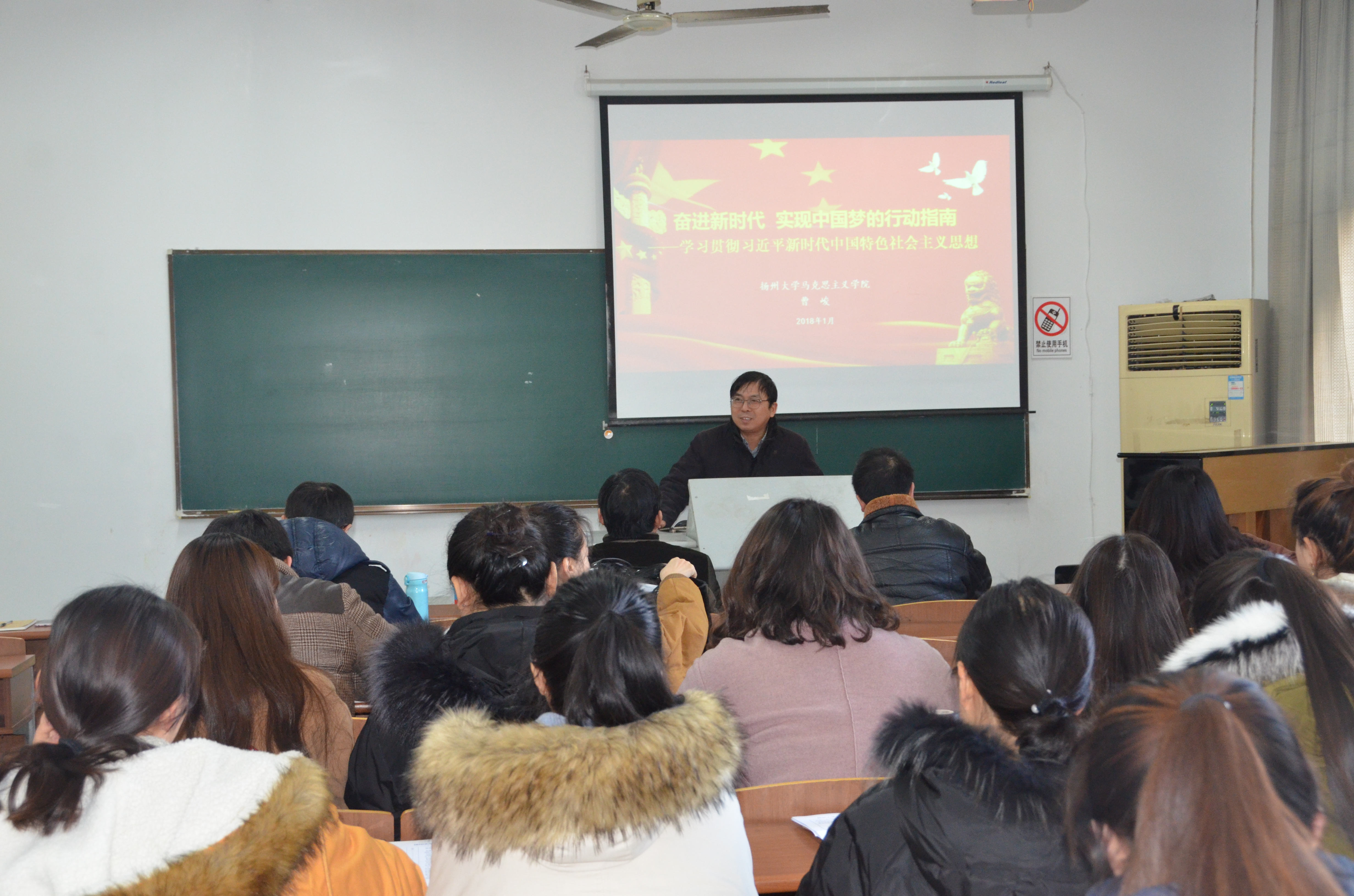 学院党委邀请了马克思主义学院曹竣教授为学院全体师生党员作题为“奋进新时代实现中国梦的行动指南——学习贯彻习近平新时代中国特色社会主义思想”专题讲座。曹竣教授从习近平新时代中国特色社会主义思想的创立过程、丰富内涵、基本特征、历史贡献和实践要求共五个方面进行了解读,重点讲解了“八个明确”的主要内容和“十四个坚持”基本方略。