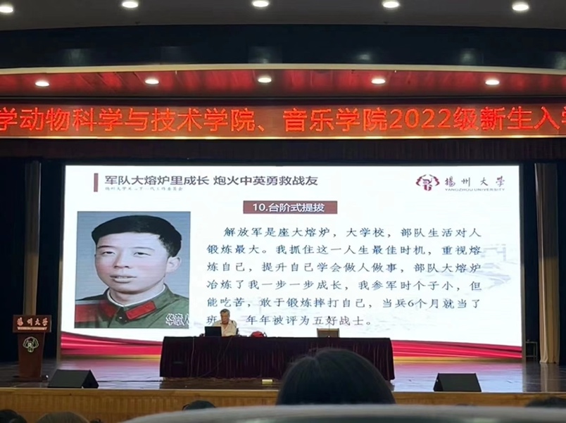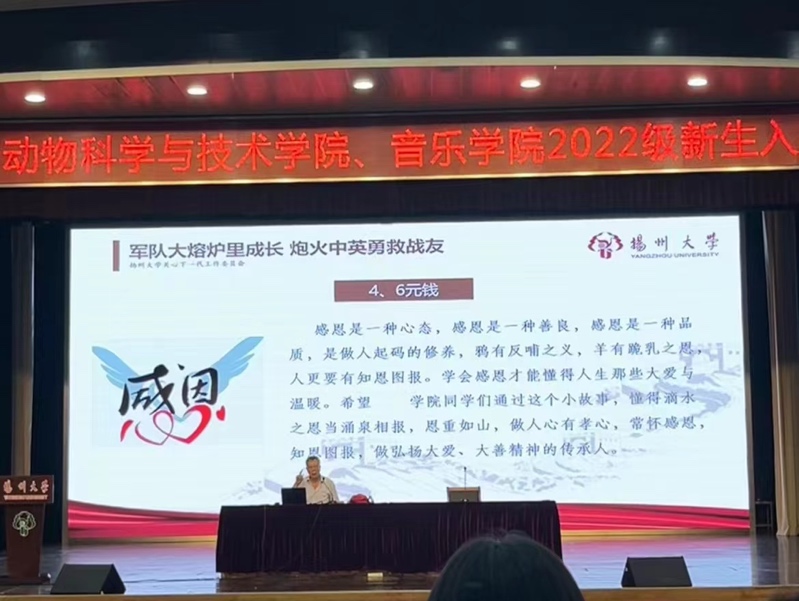 9月20日晚7点,音乐学院与动物科学与技术学院在荷花池校区三楼小剧场共同举办新生入学教育专题讲座,邀请关工委刘方云主任做“军队大熔炉里成长 炮火中英勇救战友”专题讲座。