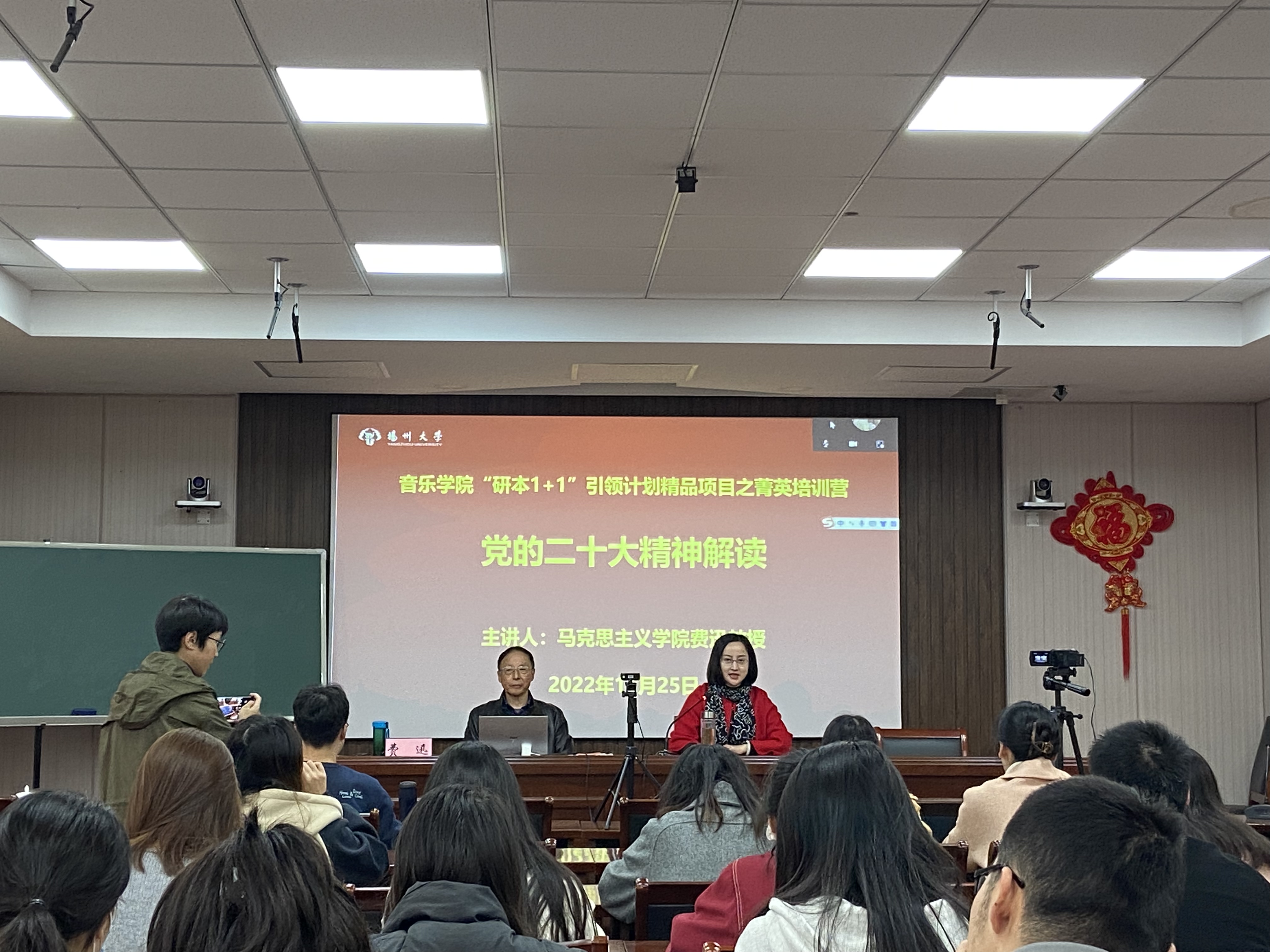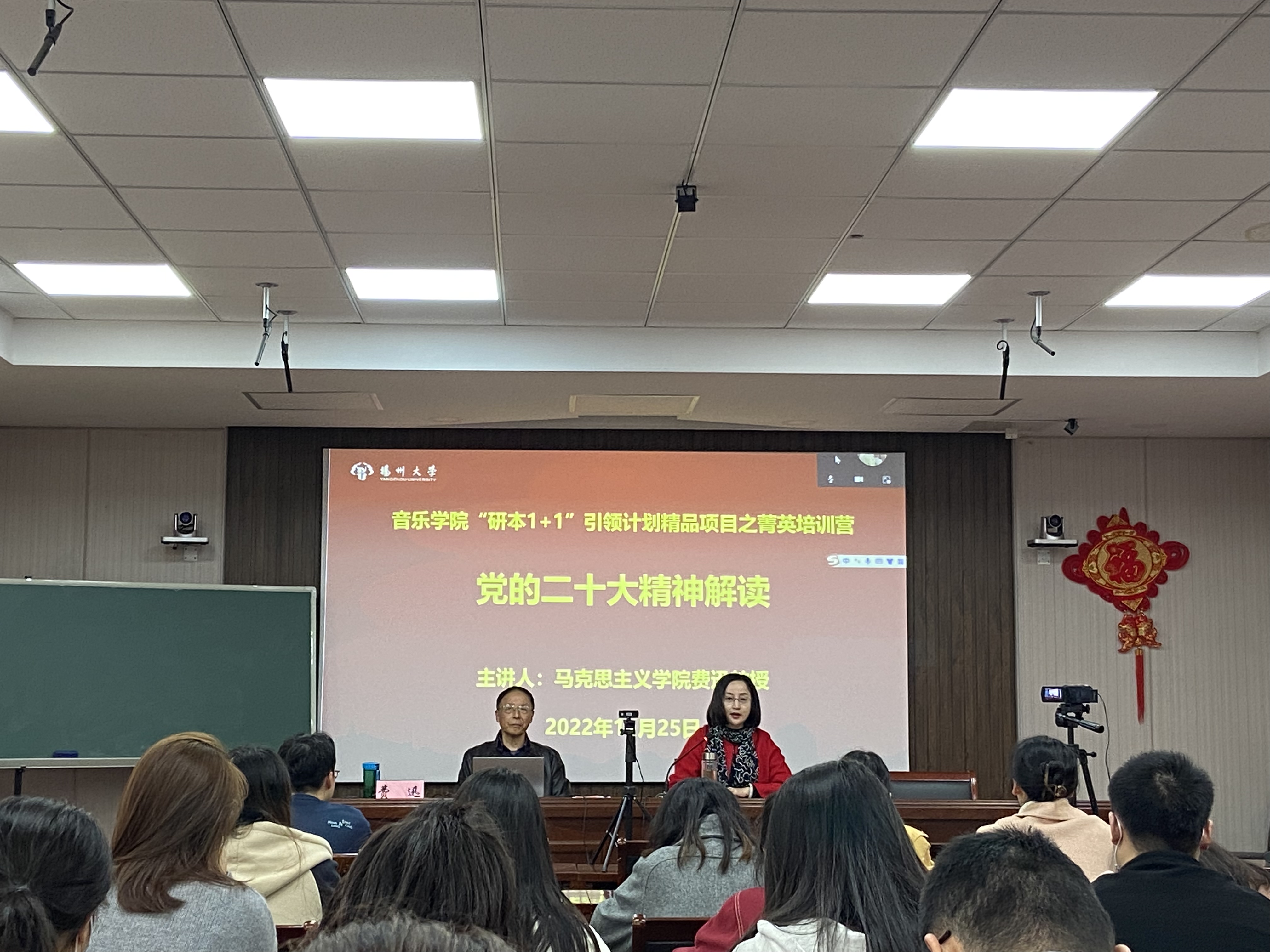 为推动党的二十大精神在校园落地生根,勉励广大青年学子坚定不移听党话、跟党走,近日,音乐学院邀请马克思主义学院费迅教授在美学堂开展“用新的伟大奋斗创造新的伟业——全面深入学习贯彻党的二十大精神”专题讲座,我院党委副书记吴伟老师主持了本次专题讲座。