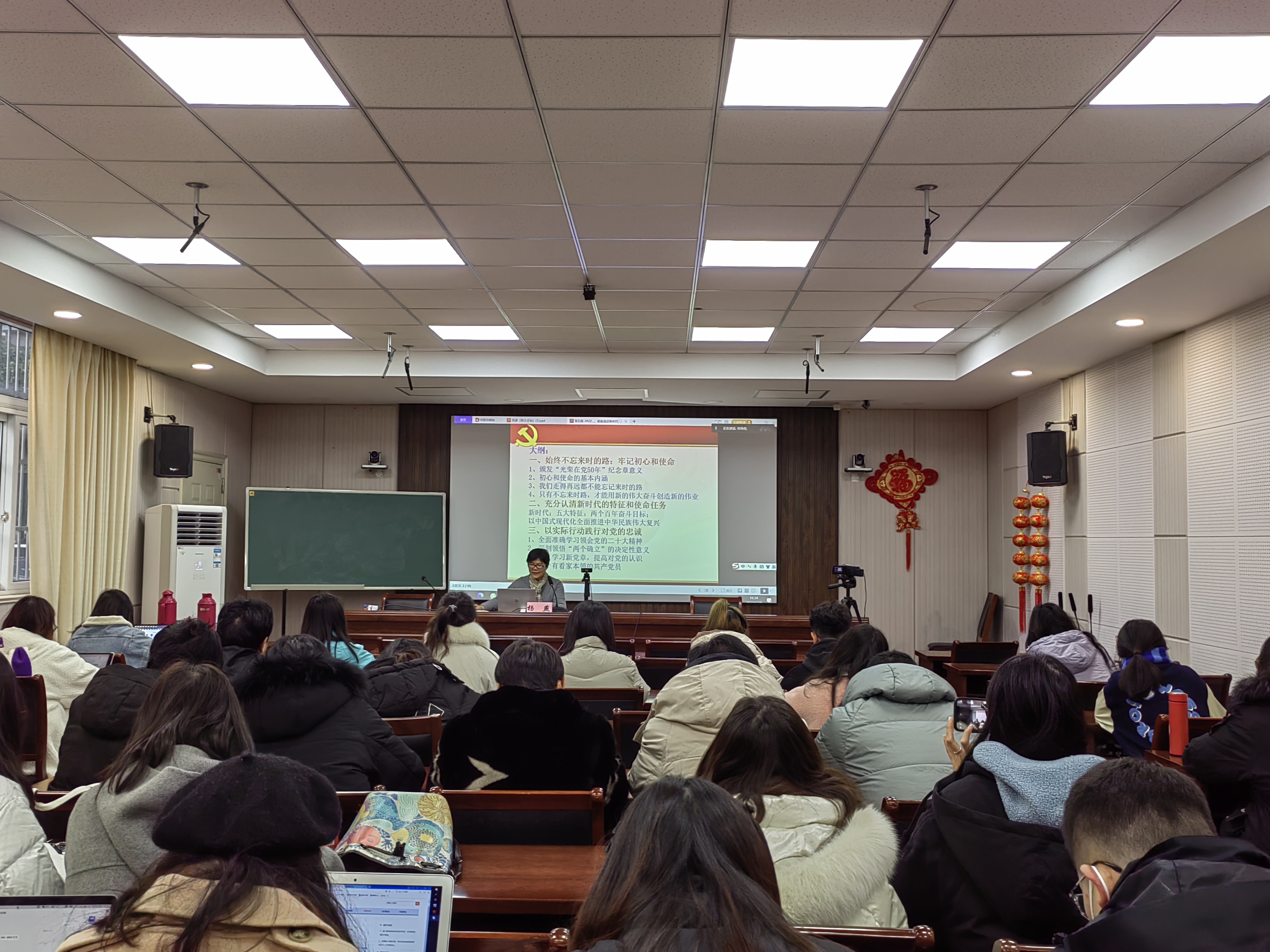 杨燕老师从始终不忘来时路-牢记初心和使命,充分认清新时代的特征和使命任务以及以实际行动践行对党的忠诚三个方面讲述了自己光荣在党51年的学习收获和成长历程,并寄语同学们牢固树立终身学习的理念,珍惜学习机会,学好本领,报效祖国。她指出,学习是新时代青年提升自我的最佳方式,唯有胸中有知识,才能为为党、国家、为人民献出自己的一份力。