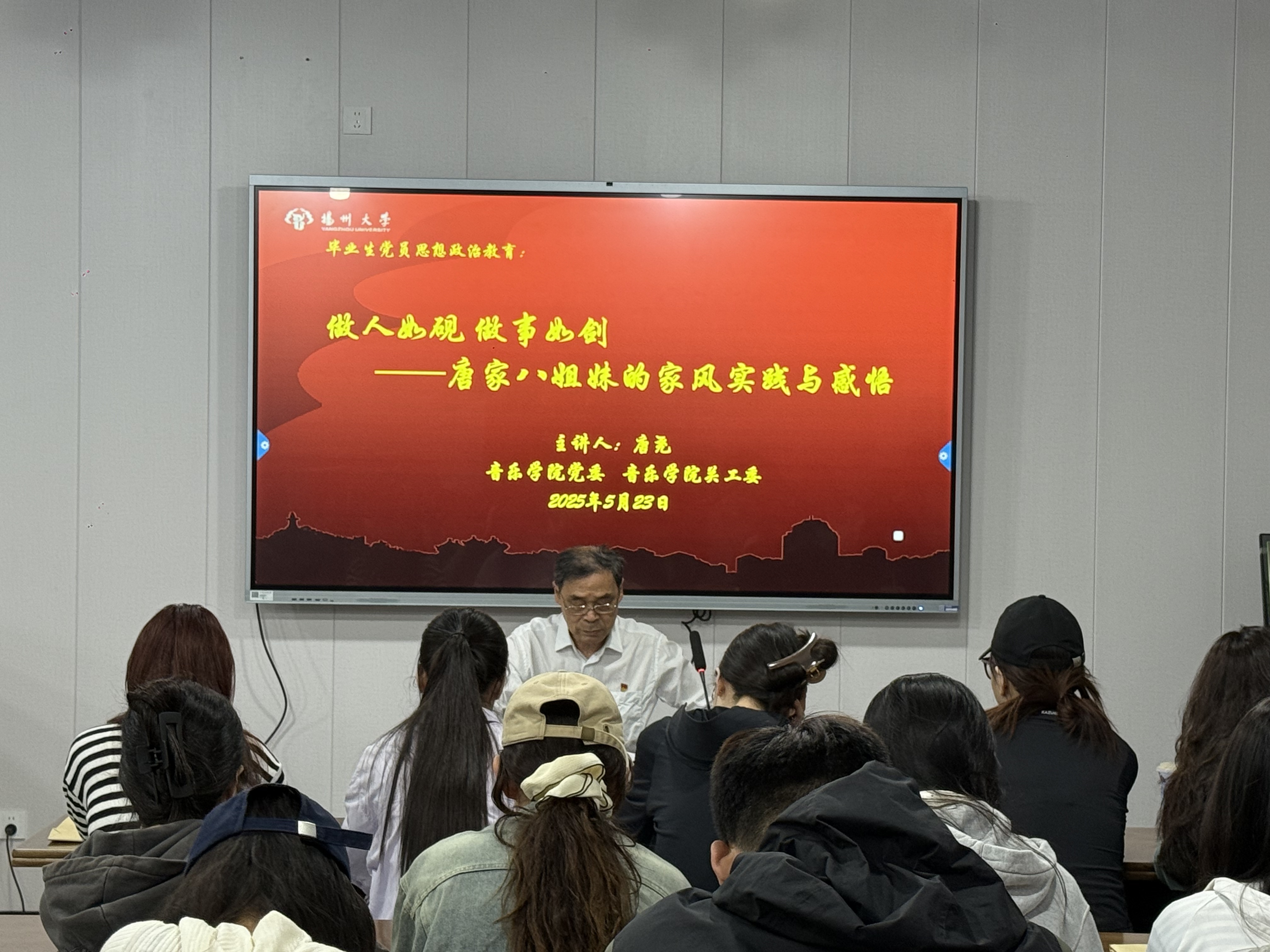 为深入开展毕业生党员思政教育,5月23日,音乐学院党委、关工委邀请扬州大学医学院原党委书记唐尧开展“做人如砚、做事如剑——唐家八姐妹的家风实践与感悟”“青春向党 奋斗强国——扣好人生第一粒扣子”“强化党员意识,增强组织纪律观念”主题党日系列活动,通过专家座谈深入构筑廉洁思想防线。音乐学院党委书记、关工委名誉主任房东升,院副党委书记、关工委主任吴伟,院综合办公室副主任、组织员王一媛以及毕业生党员参加会议。本次活动由房东升主持。