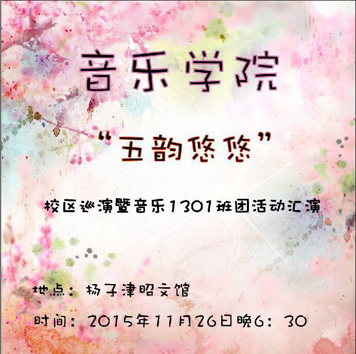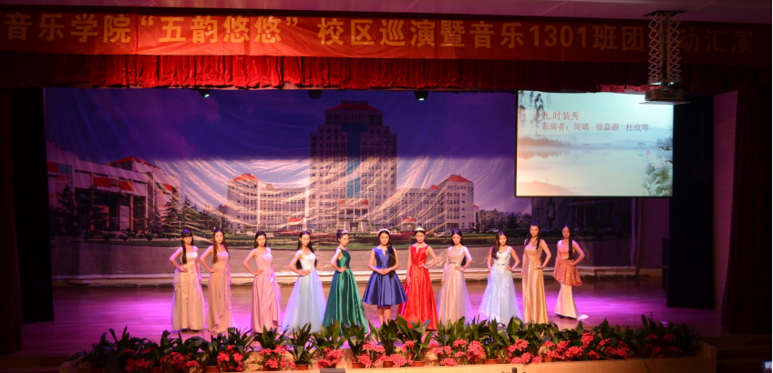 2015年11月,学院2013级团支部在扬子津校区昭文馆举行“五韵悠悠”为主题的汇报演出。本次汇报演出从开学初期拟定节目单,分配任务,组织排练检查,进行了为期五个月的进行精心准备。