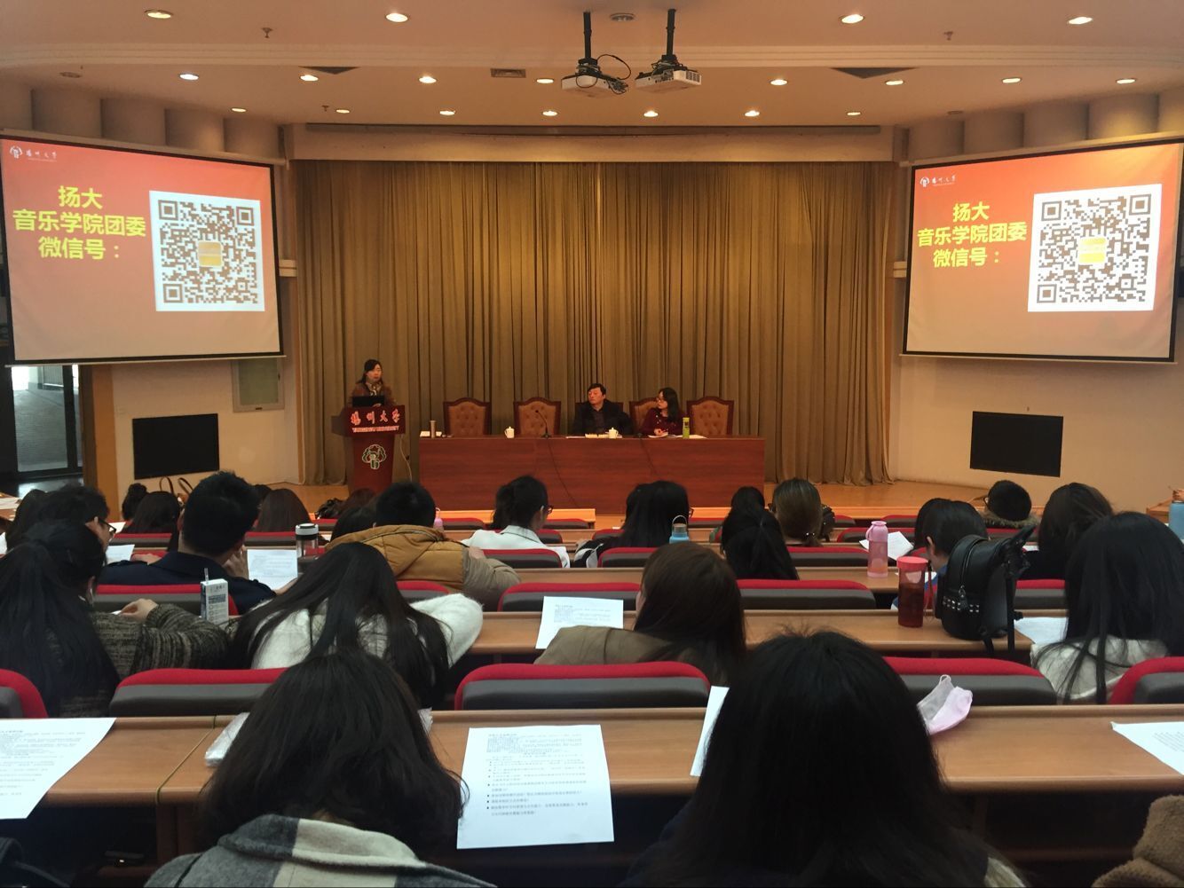 扬州大学音乐学院学风建设暨安全稳定教育大会于2016年3月22日在逸夫报告厅由团委周虹先老师主持召开。首先由院团委书记王一惠老师就以上六点进行具体阐述,促使学生对学工办工作事项和校园生活有了清晰的认识和方向感。扬州大学微信号和扬大音乐学院团委微信号也及时推送校内信息。随后院团委周虹先老师布置了近期的三项工作:包括大学生创新创业项目申报开展、学生公寓电吹风使用及存放管理规定以及清明祭扫具体时间以及注意事项。最后音乐学院党委副书记李伟对近期上课考勤纪律情况和卫生情况进行公布和分析,强调学生遵守宿舍管理手册,养成良好的生活、学习的习惯。此次大会对学风建设和宿舍安全建设方面进行了全方面的教育指导,加强了学生对自身的认识、对学校的认识,为更好地面对今后的学习生活做出了明确的规划。