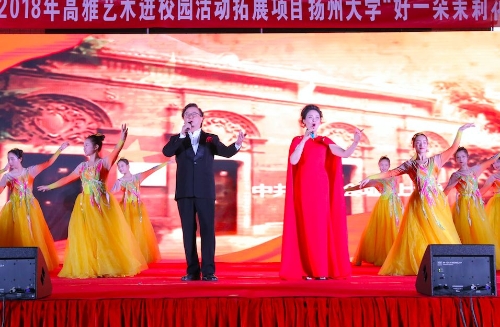 本场演出由我院副院长邵萍的歌伴舞《好一朵美丽的茉莉花》开场。美妙的旋律和跳动的音符,给整个会场染上了一层浓浓的江苏民间文化色彩。也映衬了高雅艺术的主题。接着是由扬州大学筝乐团带来的古筝重奏《梦回临安》。琴弦撩起,时而江南秀丽之景,时而战事恢宏之壮。筝曲流转,恍如隔世,仿佛穿越古今,韵味沁人心境。