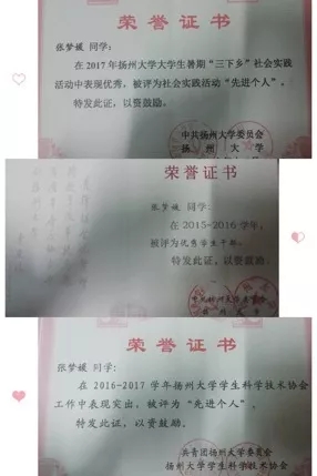 个人获得扬州大学校长一等奖学金、扬州大学优秀班干部、暑期“三下乡”社会实践先进个人等荣誉。2016年申报主持校科创项目《安徽凤阳花鼓中门歌艺术特征的研究》。