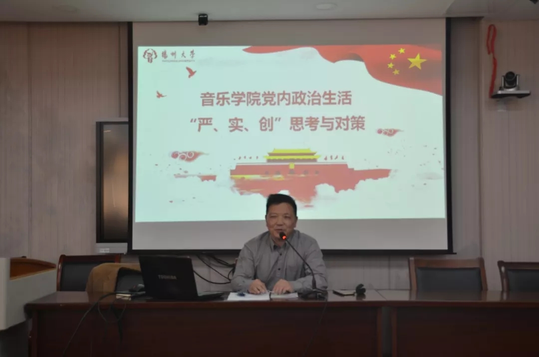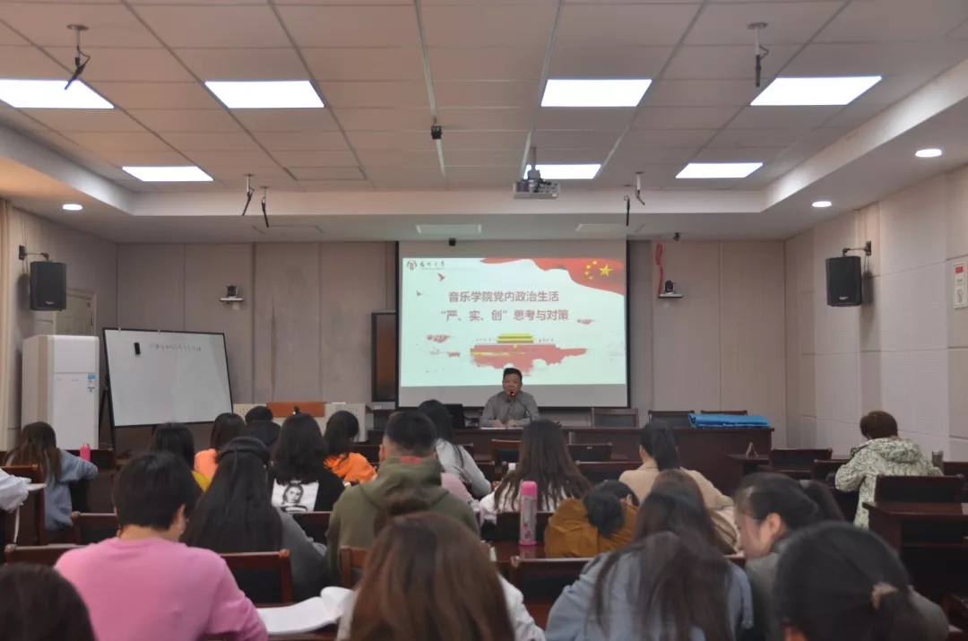 10月23日下午,音乐学院在文汇路校区21号楼美学堂举办“党内政治生活‘严、实、创’”专题党课,院党委书记李向阳主讲,全院师生党员参加了此次活动。