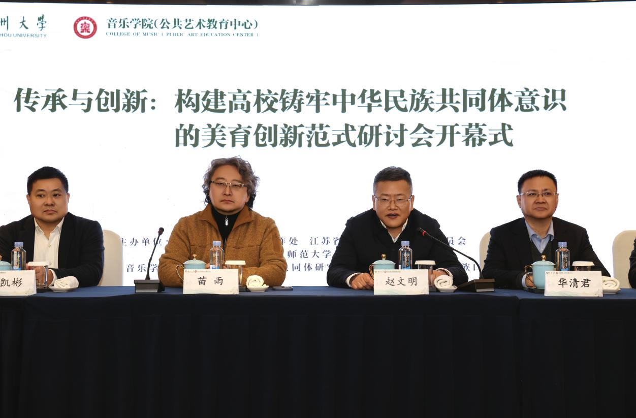 扬州大学党委常委、副校长赵文明教授代表承办单位致辞。首先简要介绍扬州大学的办学历史、学科建设成果,以及音乐学院在美育与中华民族共同体教育方面的实践与特色,特别是依托“国家民委中华民族共同体研究基地——扬州大学中华民族口头传统研究基地”开展的系列工作。他指出,美育是心灵教育与价值观教育的重要载体,高校应积极推动美育与中华民族共同体意识的深度融合,服务国家战略与育人使命。
