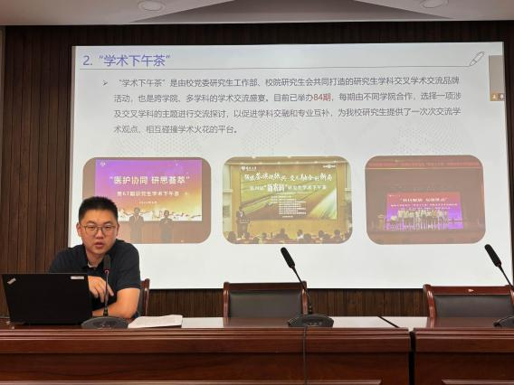 在研究生学术文化活动介绍会上,辅导员于成程老师对校内学术文化活动体系进行了全面梳理,并将重点聚焦于特色品牌活动“学术下午茶”。他详细阐释了这一专属我校研究生的学术交流平台如何为同学们搭建起观点交锋、思维碰撞的桥梁,进而构筑起跨学科、近距离的学术互动空间。