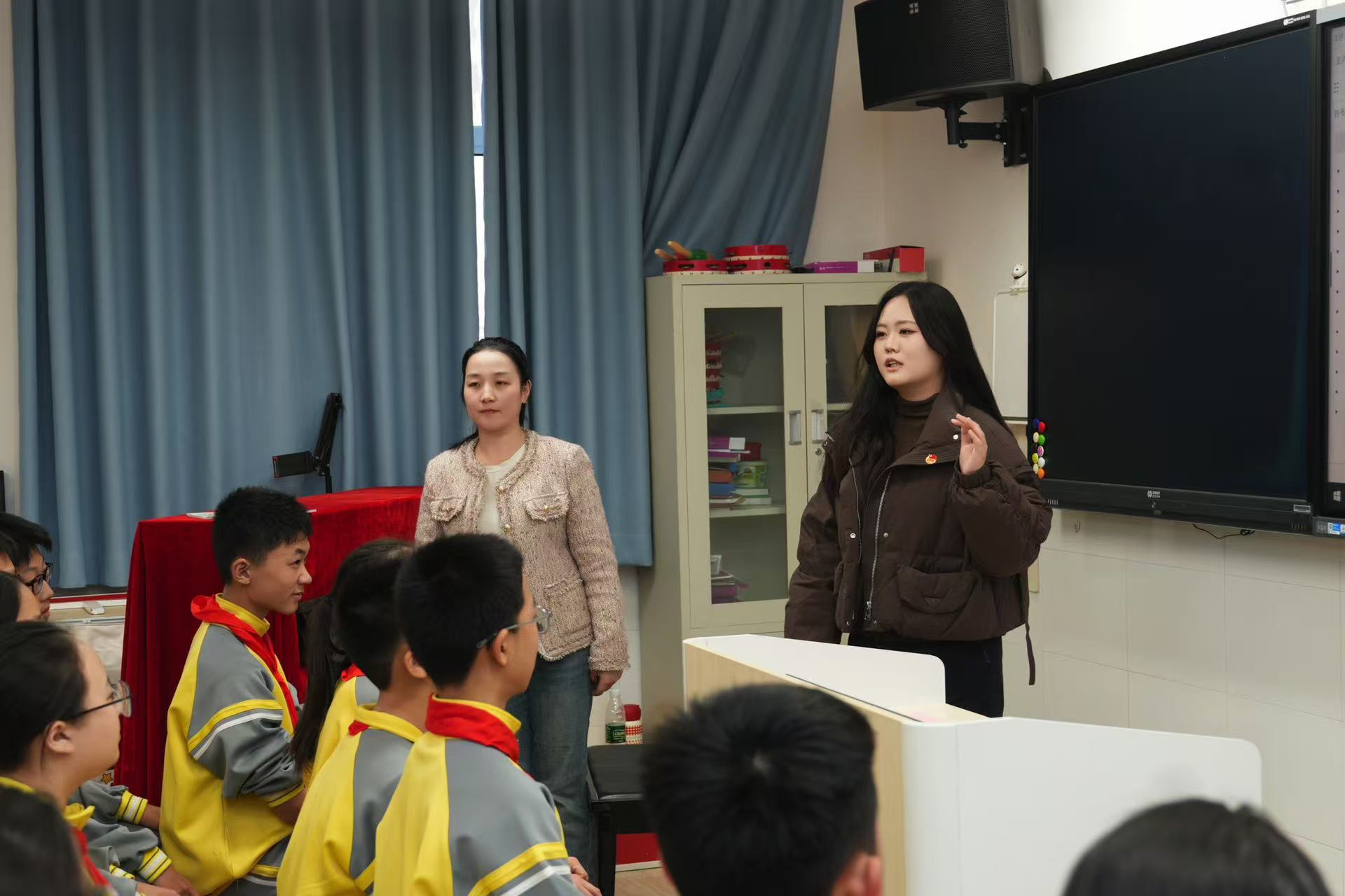 走进多省市中小学,音院学子以主理人身份落地教学实践基地,打造独具特色的音乐思政课堂。围绕“奏响运河风华,传承红色基因”主题,通过“讲、演、猜、享”多元互动,生动演绎《唱支山歌给党听》等经典曲目,并融合原创课程《运河弦歌——话扬州千年风华》,将朱自清笔下的扬州风情与民族乐器演绎相融合,在中小学课堂营造沉浸式体验,以“音乐+思政”的创新形式播撒红色种子。