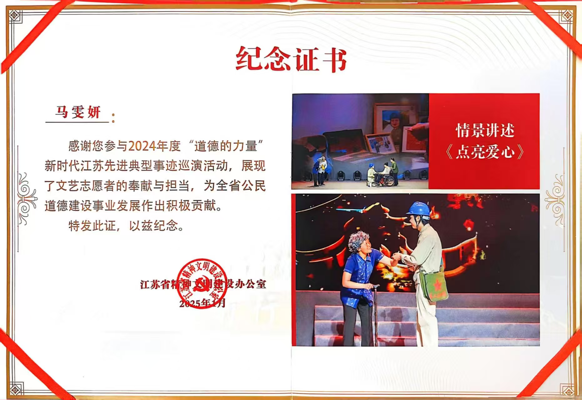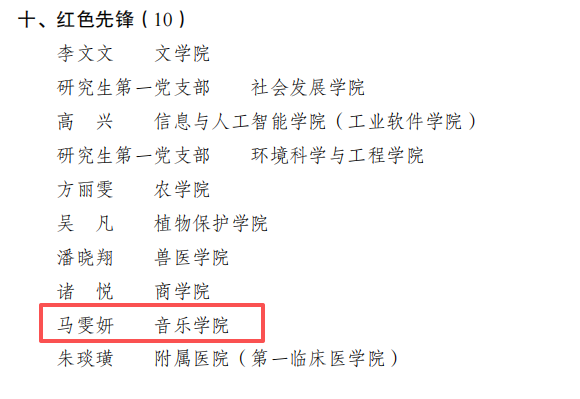 马雯妍,曾任校党建指导中心兼职副主任、音乐学院学生会执行主席、音研23班长;现任音乐学院研究生第一党支部组织委员;本科获国家奖学金、校长一等奖学金2次;研究生获国家奖学金、研究生特等学业奖学金、研究生一等学业奖学金;本科获江苏省优秀毕业生、江苏省优秀学生干部、校园先锋道德先锋、校优秀学生干部、校优秀团干部、校优秀团员、校暑期社会实践先进个人、校暑期社会实践宣传报道先进个人、校寒假社会实践先进个人;研究生获校优秀学生干部、校优秀团干部、校优秀团员、校研究生会优秀志愿者、校学生党员“领雁”行动优秀学生党员、校暑期社会实践先进个人、校暑期社会实践宣传报道先进个人、校寒假社会实践先进个人。