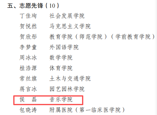 侯磊,扬州大学音乐学院2025级研究生,班级团支书、音乐学院民族乐团助理指挥。本科期间任班级学习委员、音乐学院民族乐团团长,展现出优秀的组织能力与服务精神。怀着“到祖国最需要的地方去”的初心,他加入了大学生志愿服务西部计划,远赴新疆生产建设兵团第七师胡杨河市开展志愿服务。在疆期间,他克服艰苦环境,带病坚守岗位,参与组织策划文艺演出与培训百余场,深入基层,惠及群众超20万人次。他积极挖掘当地文化资源,推动民间艺术交流,为边疆文化事业注入青春活力,荣获“大学生志愿服务西部计划全国考核优秀志愿者”等多项荣誉。