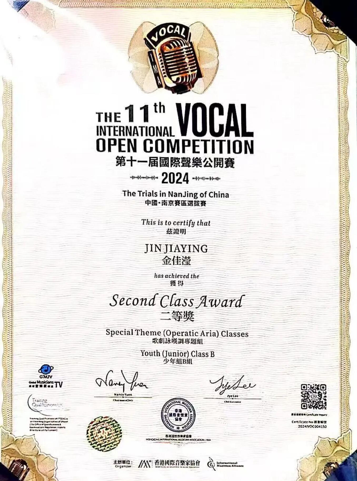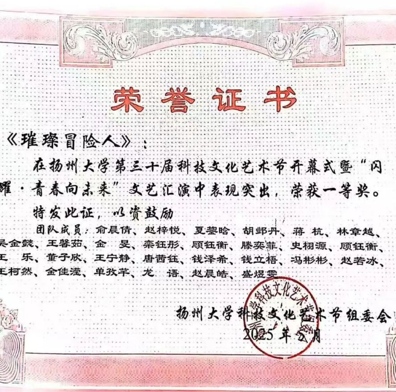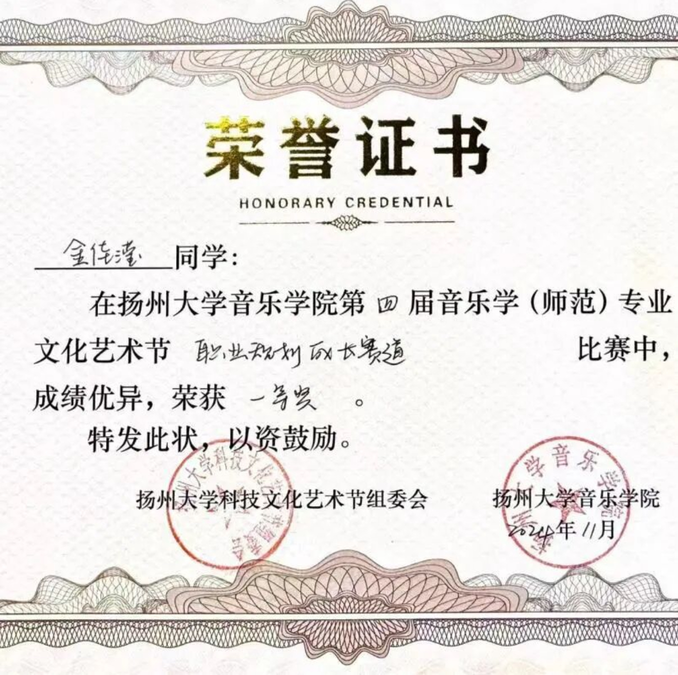 大一学年通过英语四六级;获得全国大学生英语竞赛三等奖;孔雀杯全国高等艺术院校声乐展演综合类院校展演奖;中俄青年国际声乐公开赛江苏赛区二等奖;第十一届国际声乐公开赛江苏赛区二等奖;第一届江苏省大学生人工智能艺术创作大赛音乐类三等奖;扬州大学第三十届科技文化艺术节暨“闪耀青春向未来”文艺汇演一等奖;扬州大学音乐学院2024年职业规划大赛成长赛道一等奖;扬州大学音乐学院2025年职业规划大赛成长赛道一等奖。
