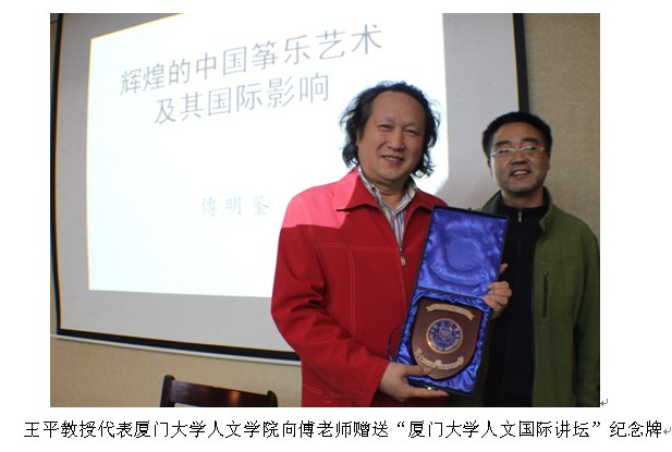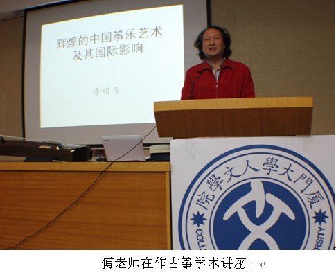 我院傅明鉴老师应厦门大学人文学院的邀请,于12月23日晚在厦门大学人文国际学术报告厅作了题为《辉煌的中国筝乐艺术及其国际影响》的学术讲座。