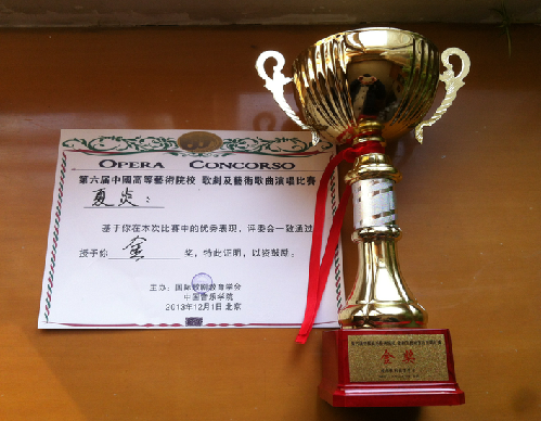 第六届中国高等院校中外歌剧及歌曲演唱比赛于2013年11月28日至12月 1日在中央民族大学举行。本届大赛是由国际歌剧教育协会、中国音乐学院主办。参赛选手有来自中央音乐学院、中国音乐学院、上海音乐学院等全国九大音乐学院及各类设有音乐专业的艺术学院、师范院校的全国数百位选手。此次比赛分为歌剧片段、中外声乐歌剧选段、中国艺术歌曲等三个类别。我院师生应邀参赛,其中夏炎老师获中国艺术歌曲组金奖,王润同学获外国艺术歌曲组银奖,巩增耀同学获外国艺术歌曲组优秀奖,为扬州大学增光添彩。