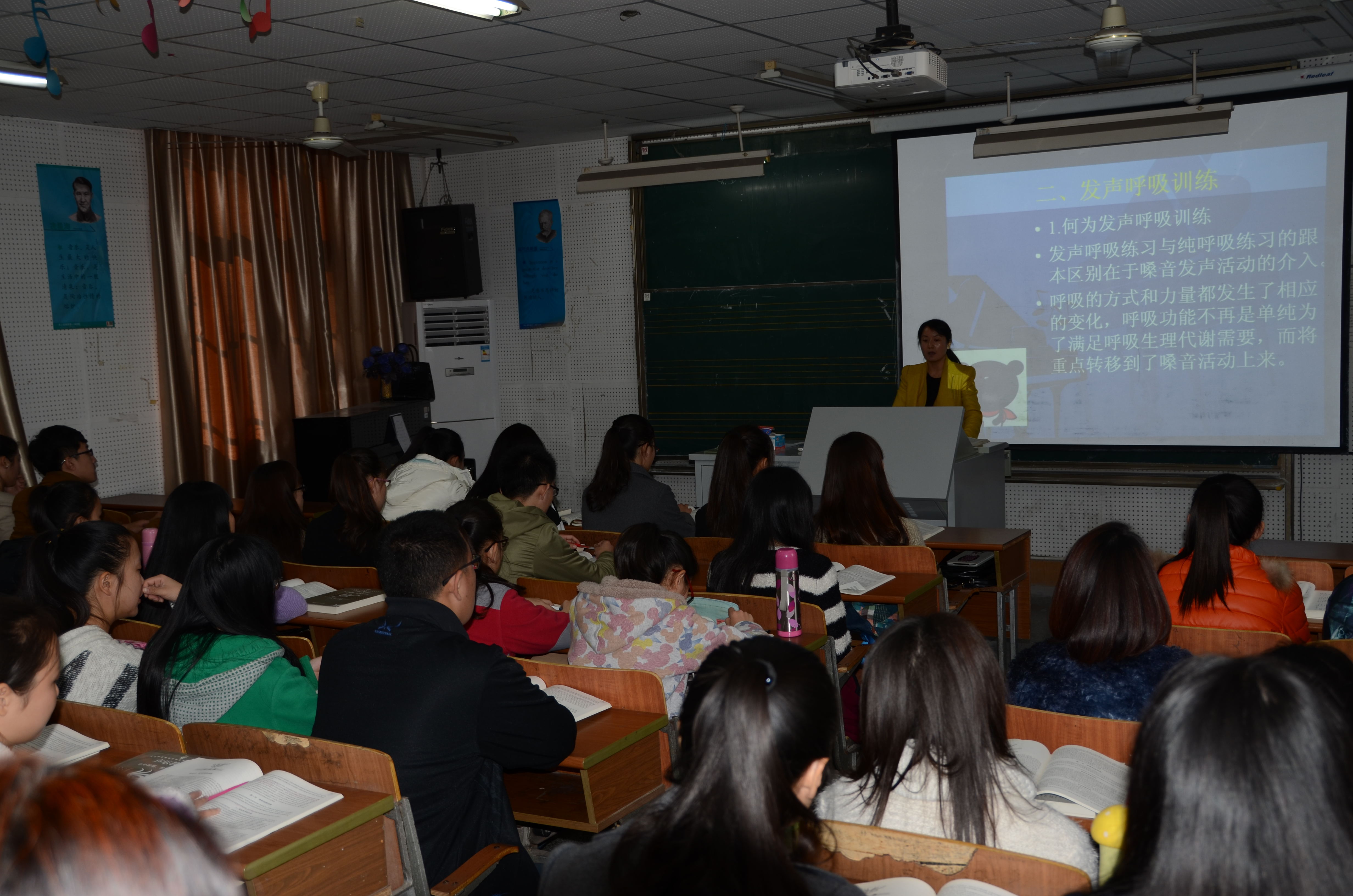 为了进一步提高声乐课程教学水平,我院于2014年11月21日下午,在音乐楼116教室开展了以“歌唱机能训练”为主题的研究性教学活动,分管教学院长和声乐教研室老师均参加了该活动。