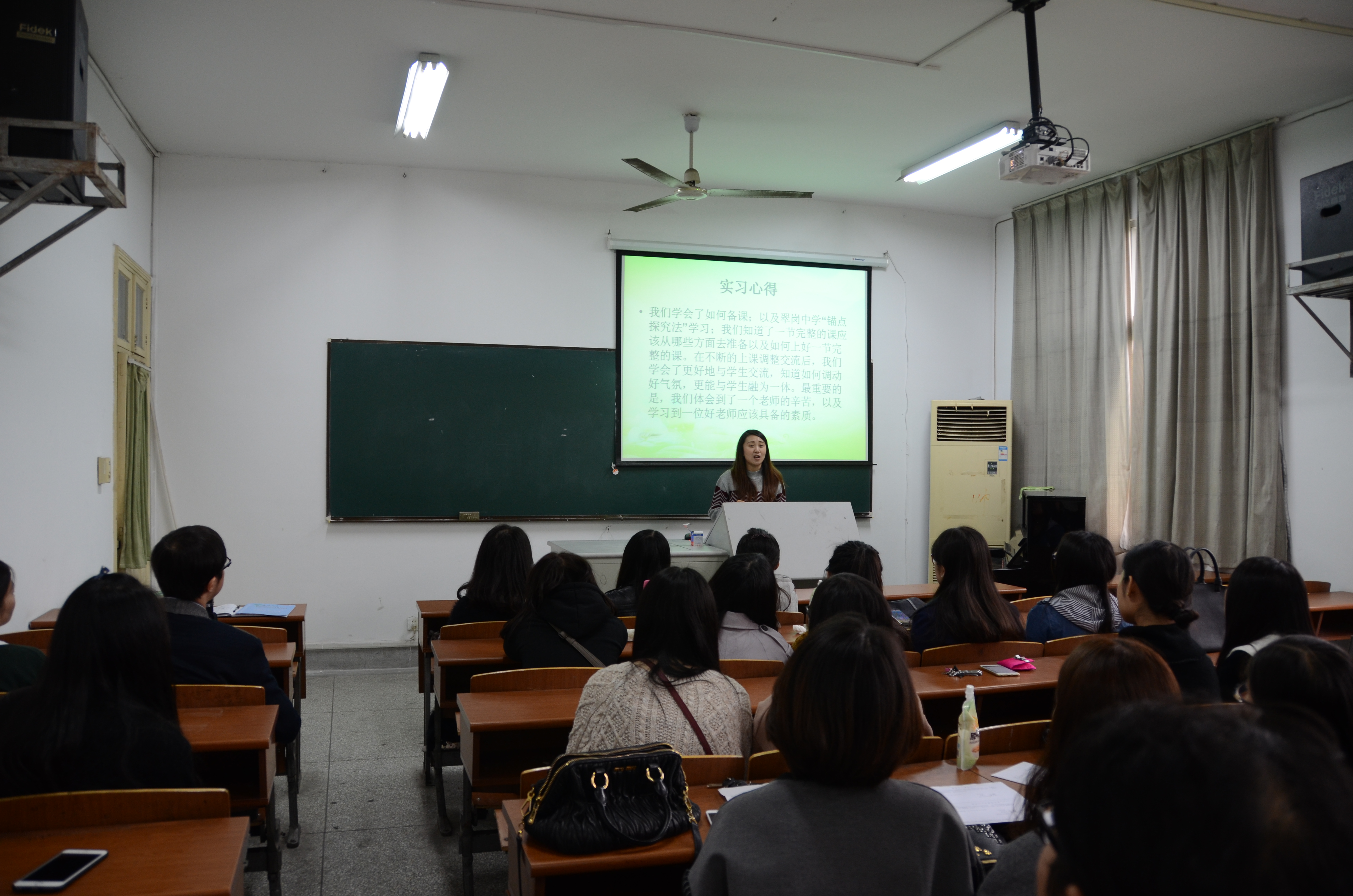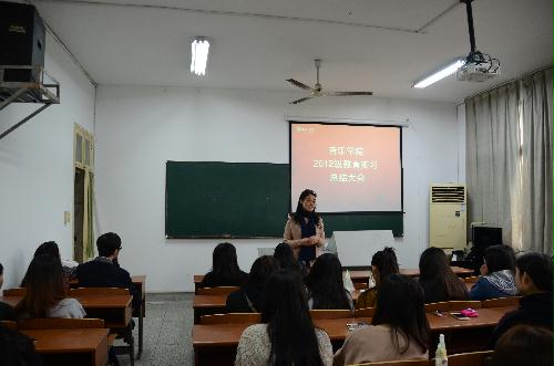 10月28日,我院召开2012级师范生教育实习总结大会,会上教学院长邵萍老师对师范生在外实习期间的各项情况做了全面的总结归纳,并对同学们今后的发展提出更高的期望要求。实习团队代表汇报了各自学校教育实习情况,与台下同学互动交流并分享其取得的经验。指导教师高洁老师和姚霆老师也参加了此次实习总结大会。