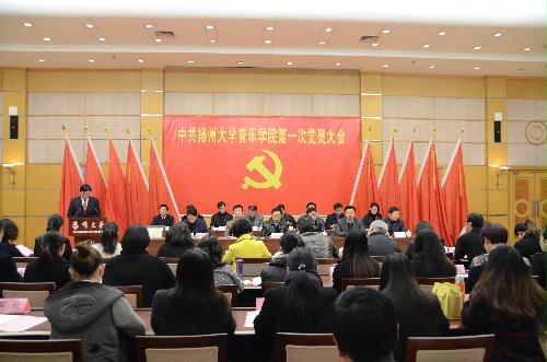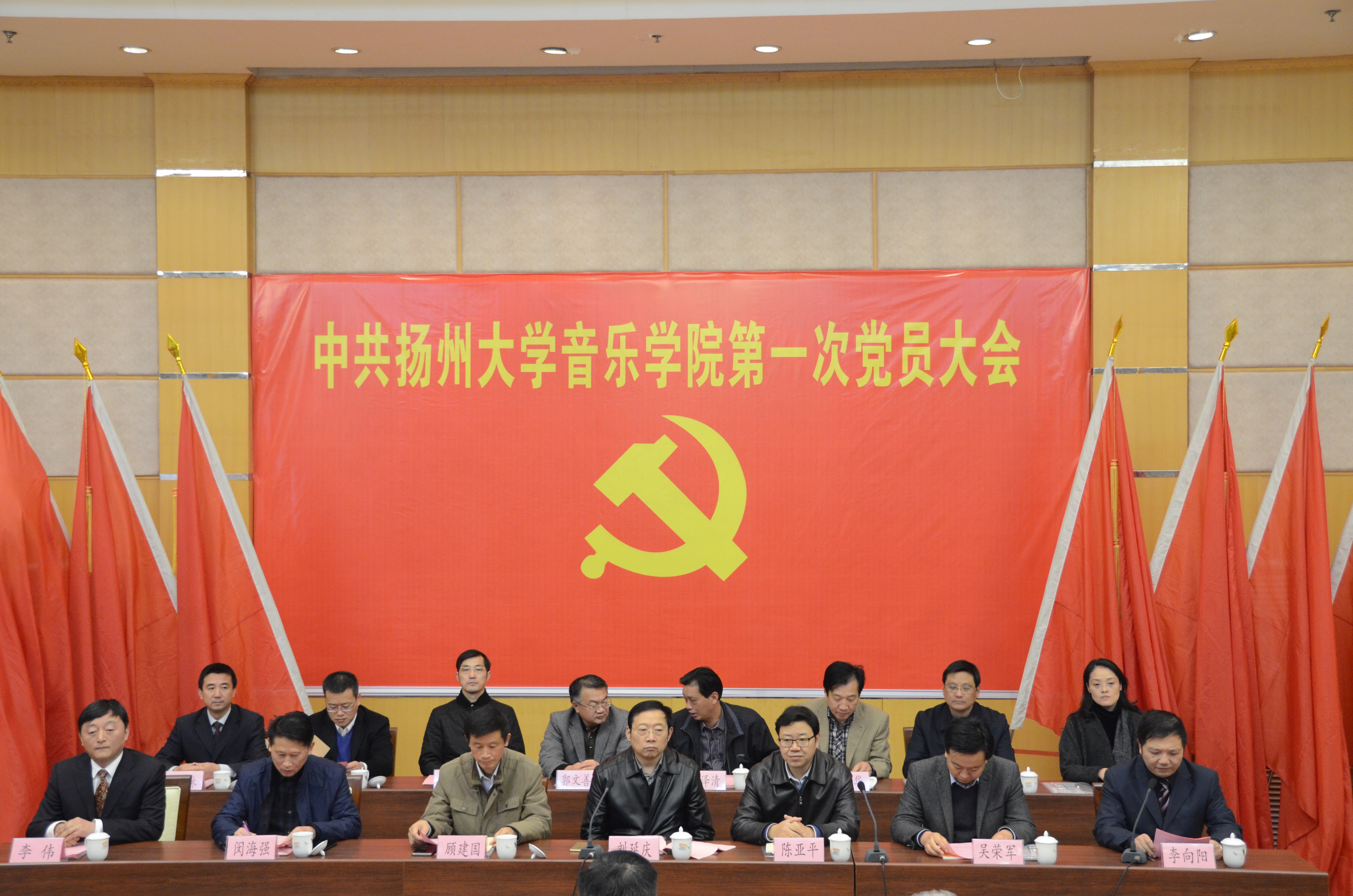 11月21日,教学主楼二楼多功能厅党旗飘扬,中国共产党扬州大学音乐学院第一次党员大会在激昂的国歌声中开幕。