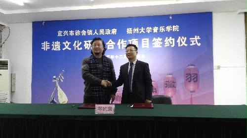 音乐学院院长张美林代表学院与徐舍镇政府签约。签约仪式后,学院专家考察了徐舍镇相关非遗项目。