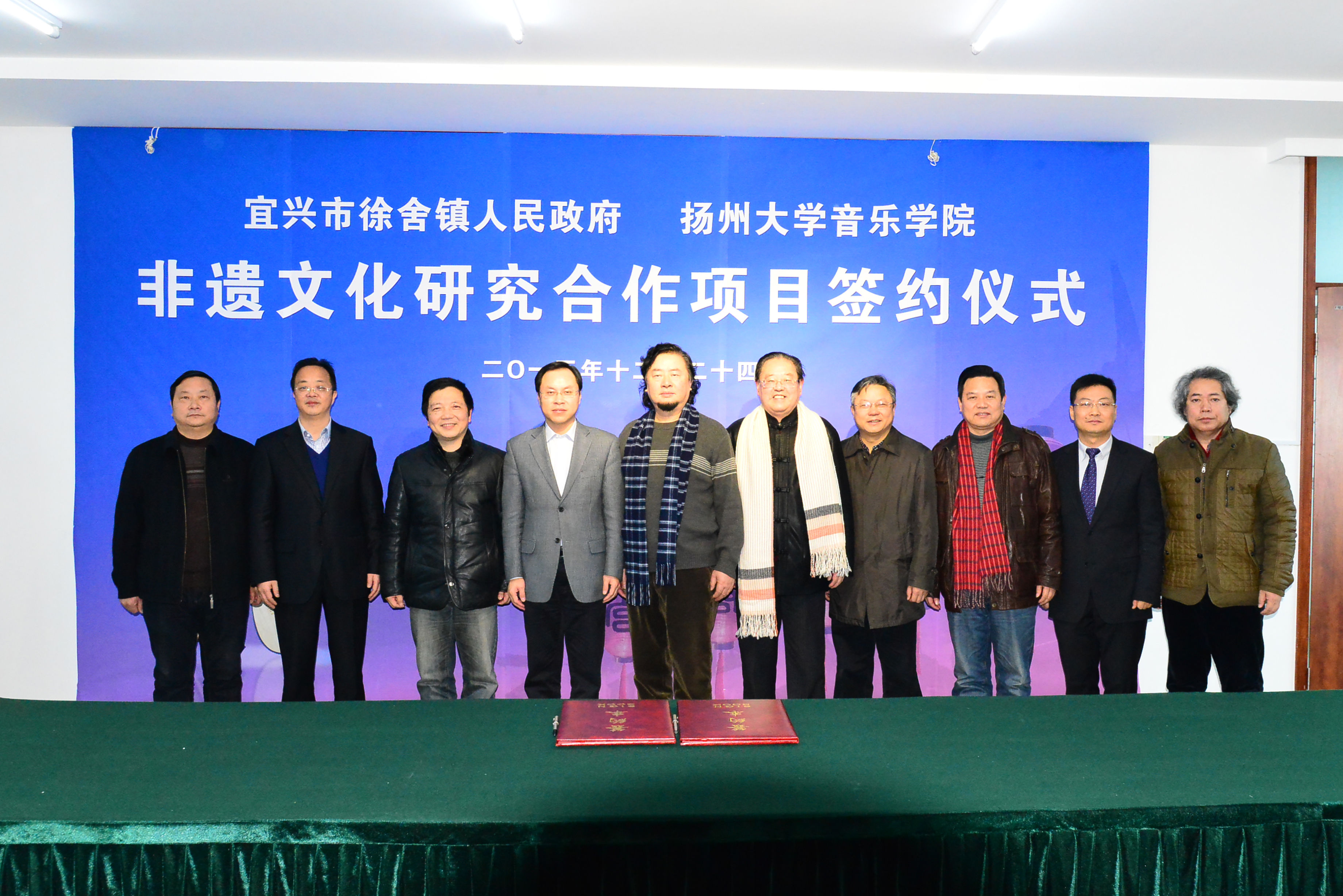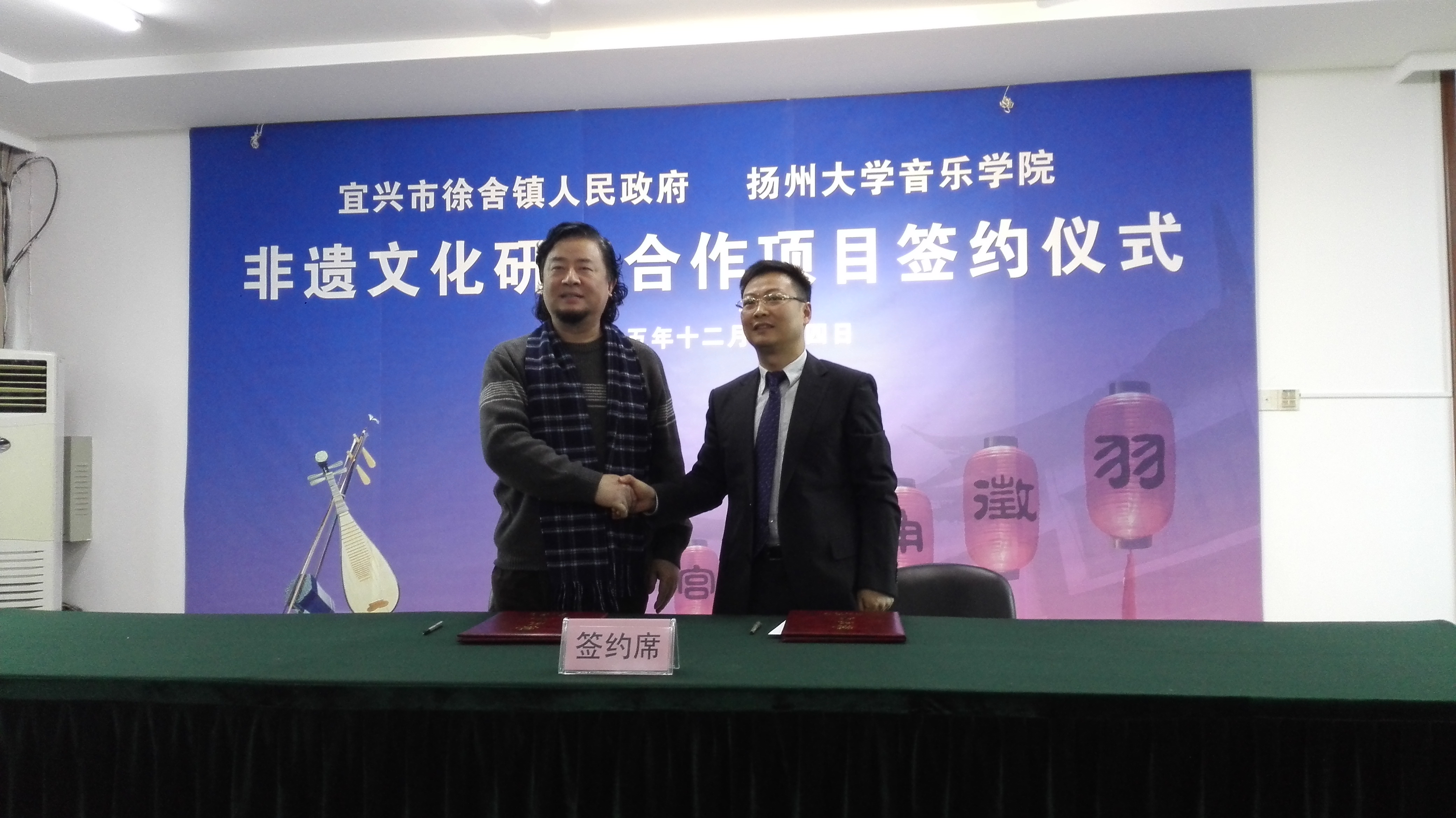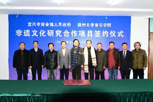 12月24日上午,音乐学院和宜兴徐舍镇人民政府非遗文化研究合作项目签约仪式在徐舍镇成功举行。院党委书记李向阳、院长张美林、教授委员会主任刘永福、特约研究员戈弘、华干林及宜兴市副市长尹志华、市文广新局、宣传部主要负责同志、徐舍镇全体领导班子出席了签约仪式。