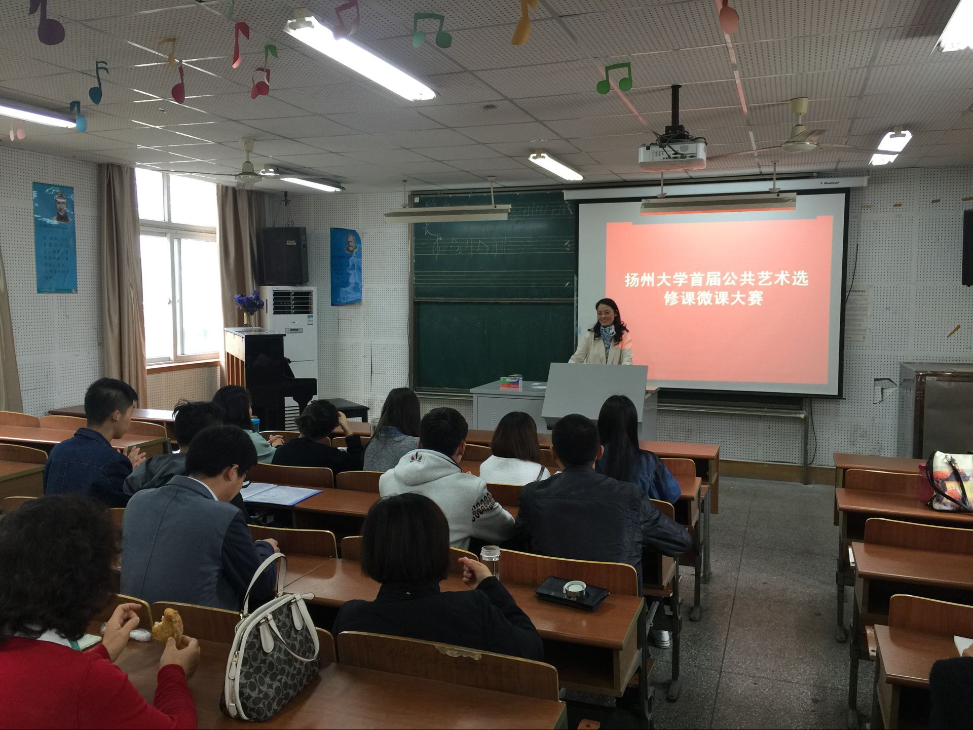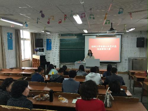 2016年4月17日上午,校公共艺术教育中心在音乐学院琴房116教室,举行了《扬州大学首届公共艺术选修课微课大赛》(初赛)。校公共艺术教育中心主任邵萍主持大赛,全体公共艺术选修课教师参与此次活动,活动邀请了音乐学院、校督导等多位教学经验丰富的专家参与点评,专家们充分肯定了此次活动的开展,对每位教师进行了详细的点评,并今后教学改革与研究提出新的要求与期望。教师们一致认为通过此次活动,对青年教师学习借鉴老教师的教学经验,改进不足,从而更好地开展教学活动有极大的帮助