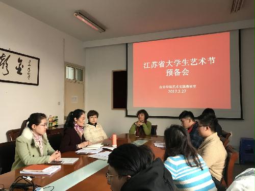 为了顺利开展江苏省大学生艺术展演,,2017年2月27日下午,公共艺术教育中心主任邵萍召开省大学生艺术节准备会议,该艺术节分为声乐表演组、器乐组、舞蹈组、合唱组等,邵萍主任向各位老师部署了节目要求,老师们纷纷提出了自己的想法。