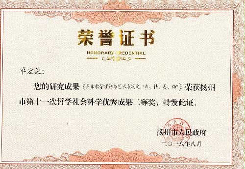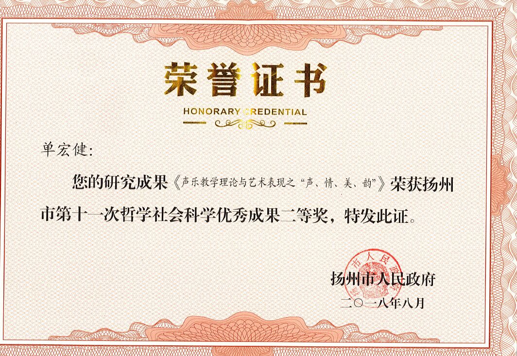 近日,我院单宏健副教授的专著《声乐教学理论与艺术表现之“声、情、美、韵”》荣获扬州市第十一次哲学社会科学优秀成果二等奖。