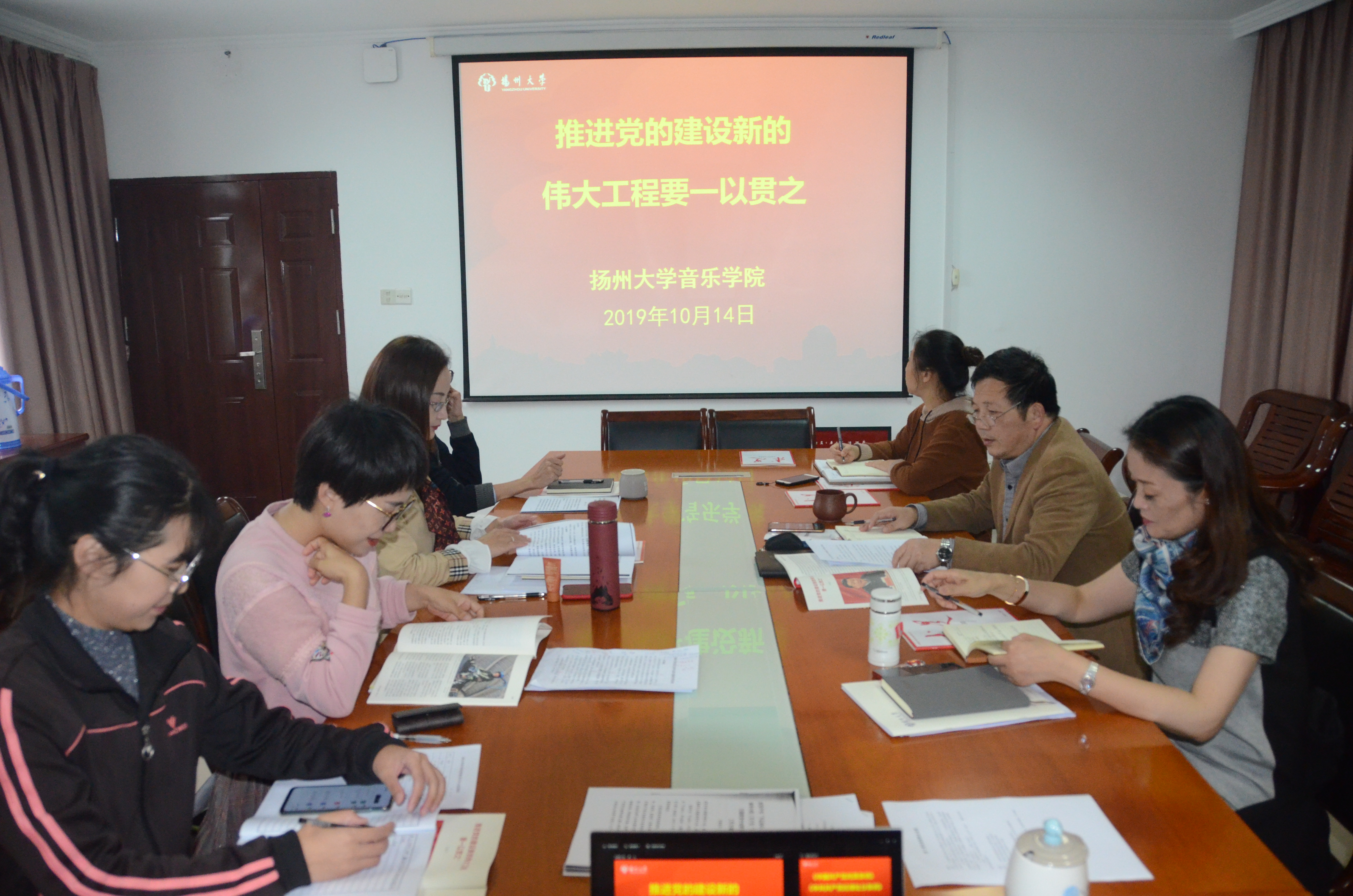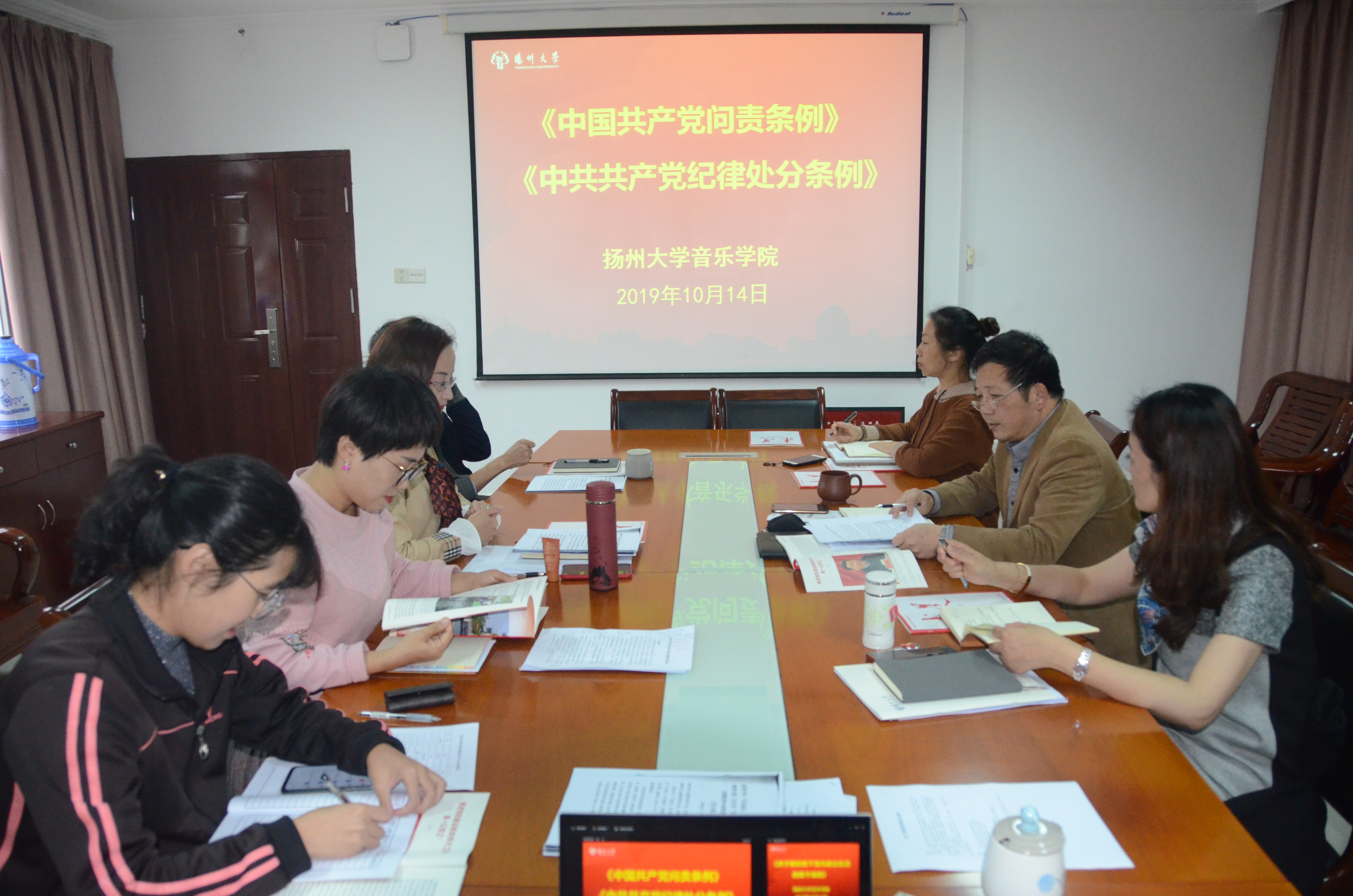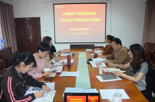 10月14日下午,音乐学院党委理论学习中心组举办专题学习会议。会上,党委书记李向阳带领中心组成员认真学习了“习近平总书记在庆祝中华人民共和国成立70周年大会上的讲话”、习近平总书记重要文章《推进党的建设新的伟大工程要一以贯之》和《中国共产党问责条例》等内容。