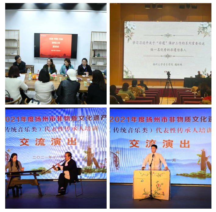 2021年11月24日至28日,扬州市成功举办了非物质文化遗产(传统音乐类)非遗代表性传承人培训班,本次培训由扬州市文广旅局主办,扬州大学音乐学院、扬州市文化馆承办,扬州古琴艺术(广陵琴派)、高邮民歌、扬州清曲、扬州评话、扬州弹词、扬剧等10多个非遗项目70余名市级以上代表性传承人参加了培训。