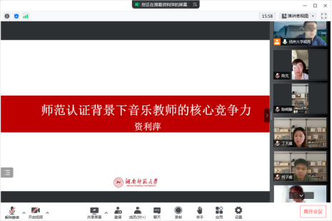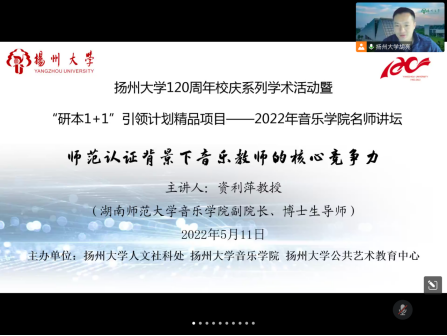 5月11日下午3点,我院在线上举办了扬州大学120周年校庆系列学术活动暨“研本1+1”引领计划精品项目——音乐学院名家讲坛之“师范认证背景下音乐教师的核心竞争力”,学院部分教授、青年教师、研究生总计152人参加了本次学术讲座。讲座由湖南师范大学音乐学院副院长、博士生导师资利萍教授主讲。会议开始前,音乐学院院长邵萍教授和院党委书记李向阳老师对资利萍教授受邀我院名师讲坛做学术报告表示欢迎。本次讲座由音乐学院副院长胡亮教授担任主持。
