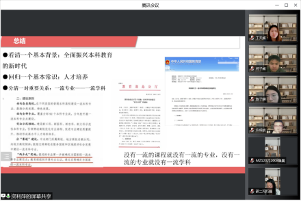 报告过程中,资教授将“以本为本,四个回归”追溯至本科教学人才培养的原点,列举中共中央、教育部、中央政法委等相关部门的重要文献,并通过几场全国高校本科教育工作会议的整合分析,新时代以全面振兴本科教育为背景,回归人才培养的基点。本科教学的核心理念包括以学生为中心的教育理念、“产出导向”的教育体系、“持续改进”的质量观。以上所提及的教学理念,需要在教学行为中有所实践,更为重要的是对成果的及时检验。在会议尾声,资教授又对我院师范认证工作提供了指导性意见,对部分材料的拓展进行生动说明,也表达了对我院未来建设的期盼与诚挚的祝福。窗体顶端