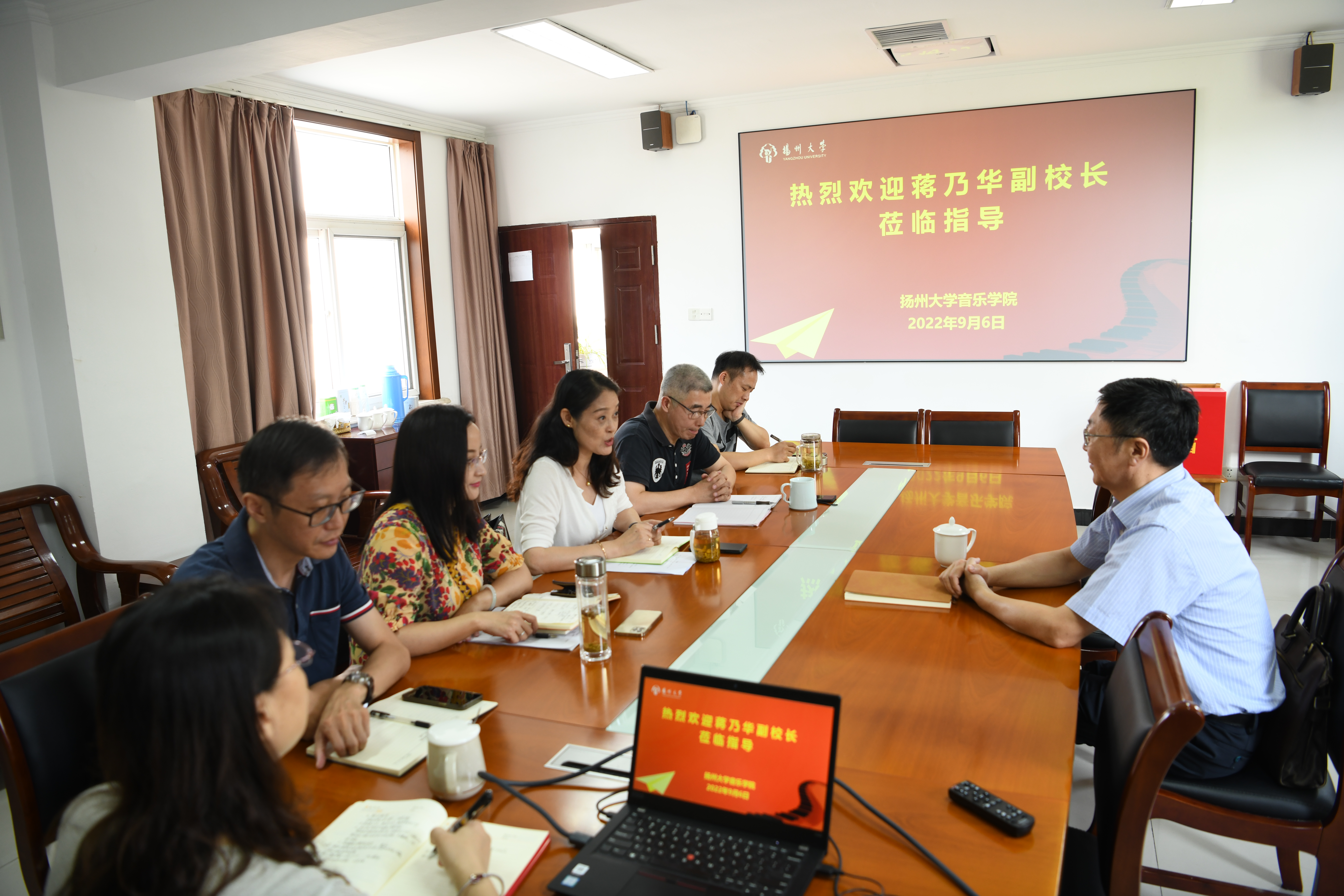 9月6日,校党委常委、副校长蒋乃华深入音乐学院走访调研。他认真听取了音乐学院负责同志关于学院各项事业发展情况的汇报,充分肯定了学院在党的建设、学科发展、教学工作、学生工作、公共艺术教育、对外宣传等方面所取得的成绩,并对学院发展进行交流并提出明确要求。蒋乃华指出,学院要进一步加强内涵建设,全面提升学科建设水平和人才培养质量,充分发挥公共艺术教育在全面育人中的重要作用,要不断创新工作思路,彰显办学特色,以更加饱满的热情投入工作,为学校高质量发展作出应有贡献。