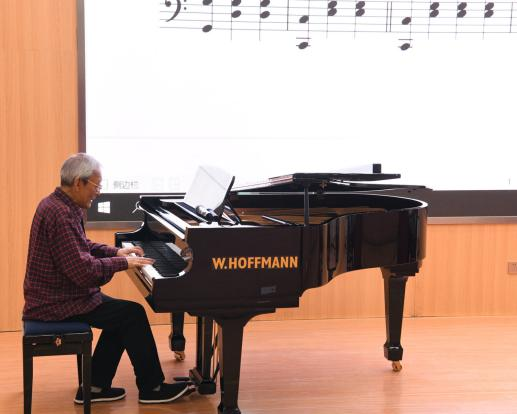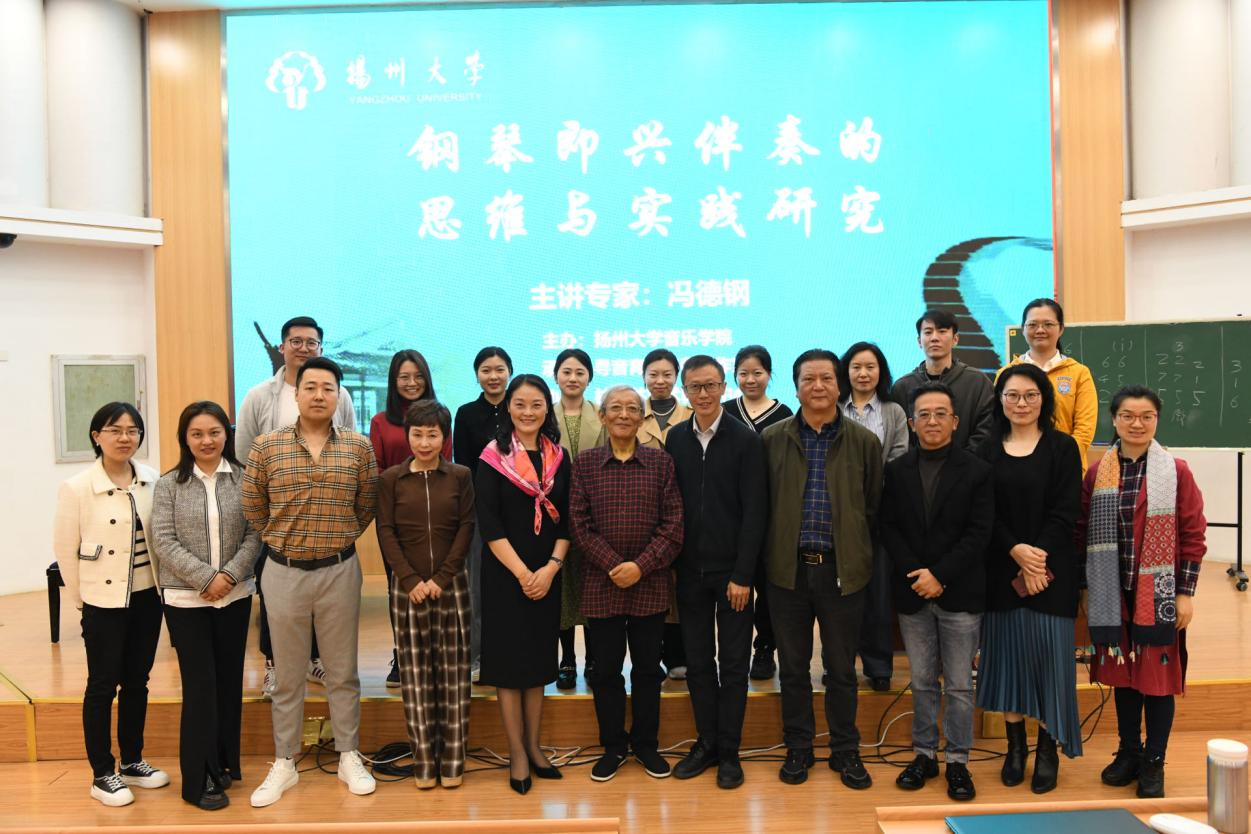 4月27日上午,我院在逸夫图书馆报告厅举办了《钢琴即兴伴奏的思维与实践研究》专题讲座。本次讲座由南京师范大学音乐学院冯德钢教授主讲,音乐学院院长邵萍教授主持。出席此次讲座的有音乐学院院长邵萍、音乐学院副院长姚霆、音乐学院专业主任、各教研室主任、钢琴教研室全体老师、寻音育美名师工作室成员、音乐学(师范)专业20级、21级全体成员以及全体音乐教育方向研究生。讲座由扬州大学音乐学院主办、寻音育美名师工作室承办、校公共艺术中心协办。