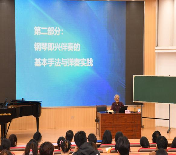 整场讲座冯老师用风趣幽默的语言与精彩美妙的演奏,深深地打动了在场的每一位师生,场内多次响起热烈的掌声。冯老师还与同学们进行了亲切地交流,解答了民族调式声乐作品如何进行和弦配置的疑问。同时,冯老师鼓励同学们多练多思,在实践中不断积累即兴伴奏的经验。