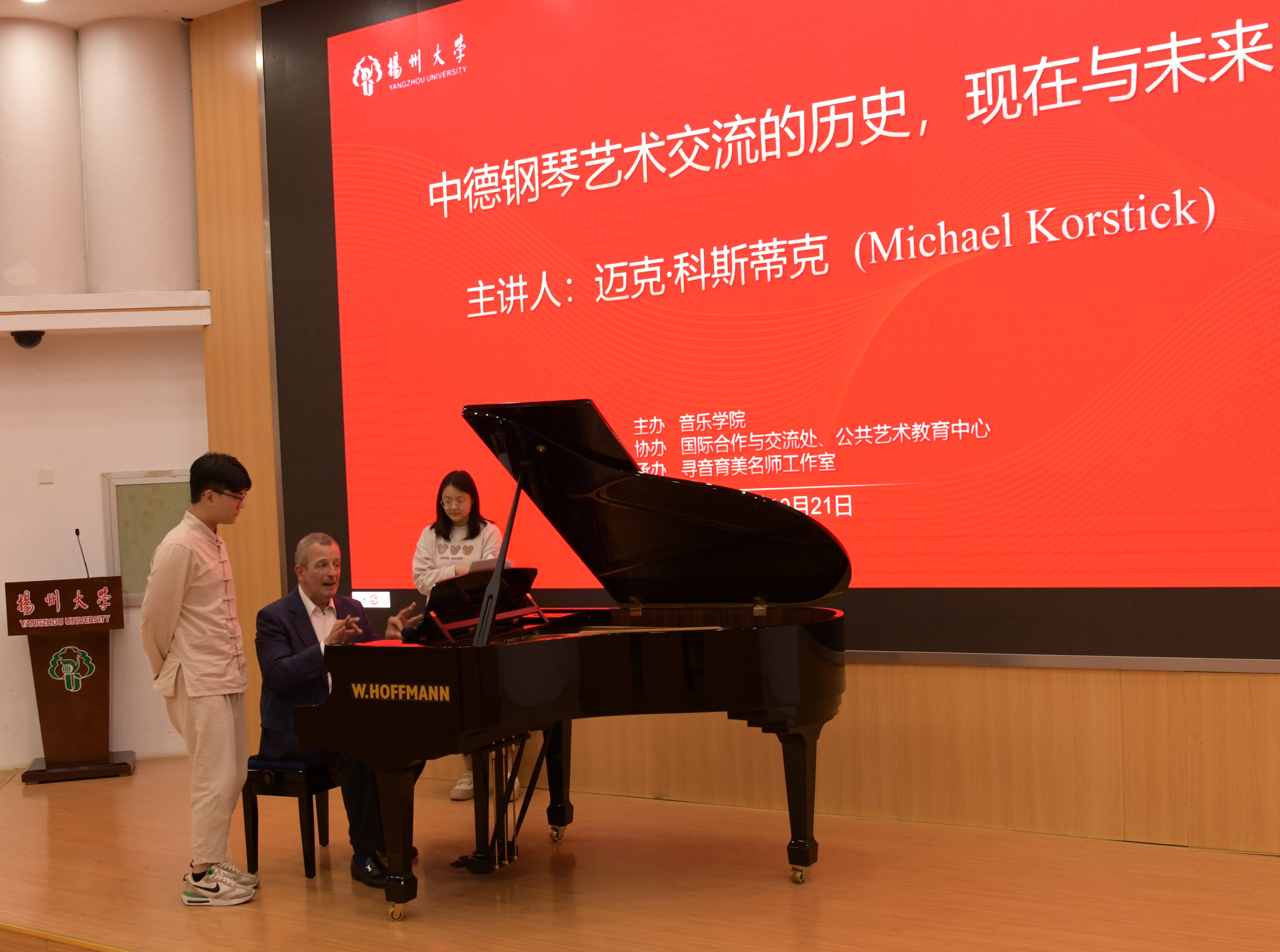 为进一步培育和提升学院学生的专业素养,加强钢琴教学质量建设,10月21日下午,学院邀请著名钢琴家迈克•科斯蒂克在逸夫图书馆报告厅举办“中德钢琴艺术交流的历史,现在与未来”钢琴大师班讲座,这同时是音乐学院钢琴教学国际学术论坛系列讲座活动之一。音乐学院院长邵萍老师、副院长姚霆老师和钢琴教研室主任付龙老师以及钢琴教研室全体老师,全院在校学生参加本次讲座。