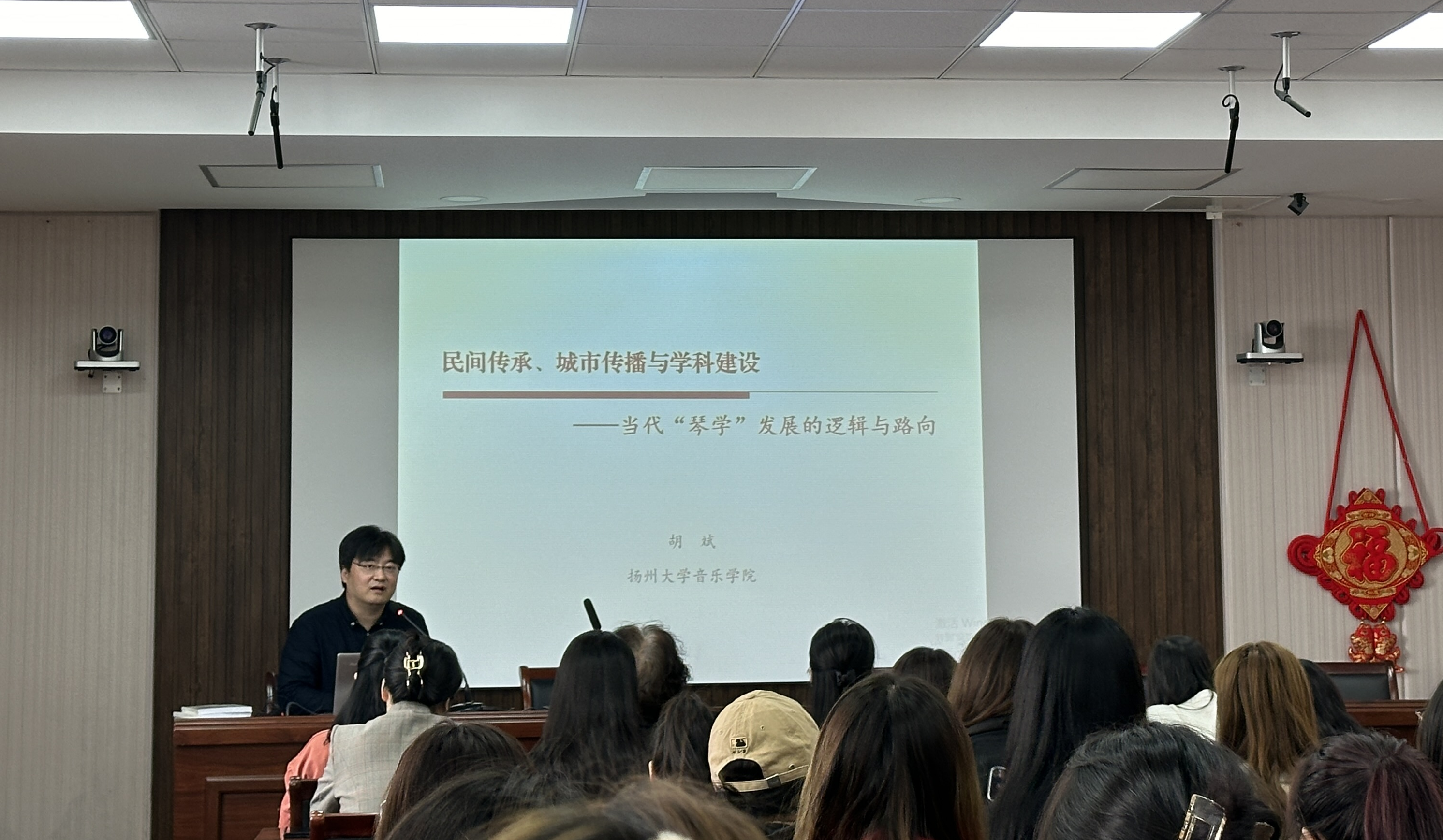 戴晓莲教授为上海音乐学院博士生导师、上海市古琴非遗传承人,此其古琴师生团队到古琴文化重镇扬州采风交流,胡斌教授的学术讲座为在场师生提供了琴学研究的新视角。