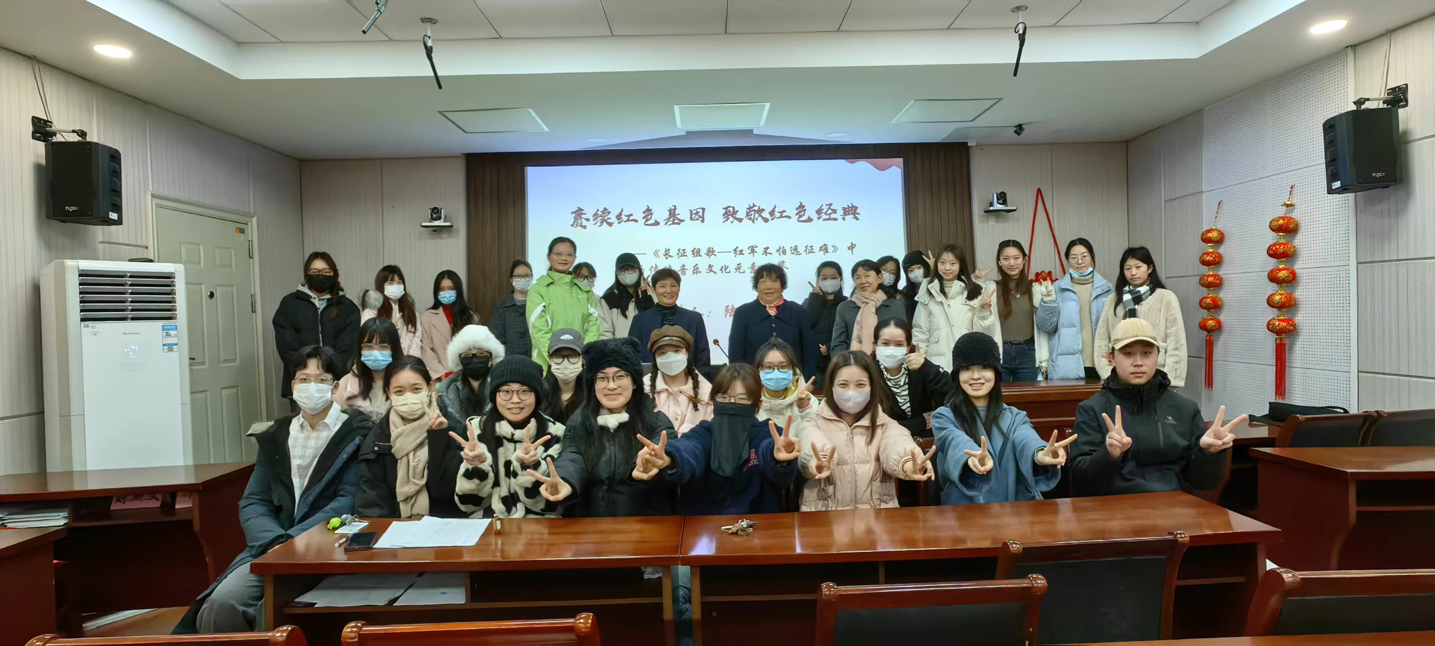 陆老师边讲解边播放视频,一个半小时的讲座时间里,大家对《长征组歌》中10首乐曲的各自民族音乐风格和创作特点有了整体认知,在视听相结合的观赏过程中更好地理解欣赏了这部在20世纪60-70年代风靡全国、人人爱听、个个会唱的经典红色爱国组歌。讲座互动环节,在一位女研究生的领唱和指挥下,大家随着音乐一起高唱《四渡赤水出奇兵》,这首采用云南花灯曲调、旋律优美、轻快俏皮的经典热歌,立即激起大家热情欢乐的情绪。