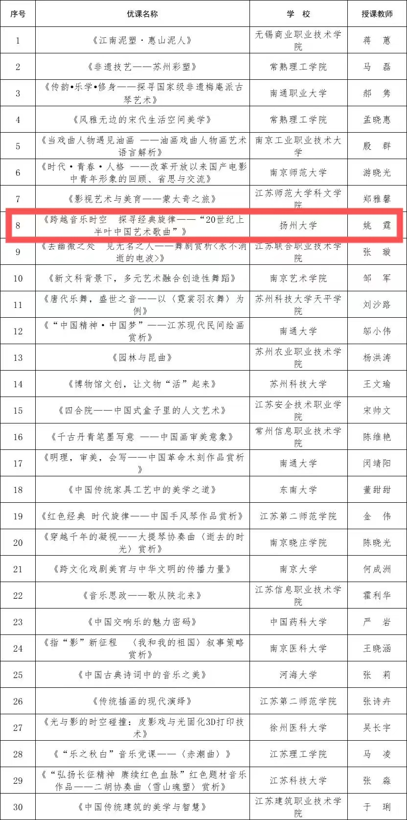 入选的30门优课来自省内27所高校,扬州大学就是其中一所。其中,扬州大学音乐学院报送的优课:由姚霆副教授主讲的《跨越音乐时空 探寻经典旋律——20世纪上半叶中国艺术歌曲》成功入选2023年省高校美育大讲堂优课。