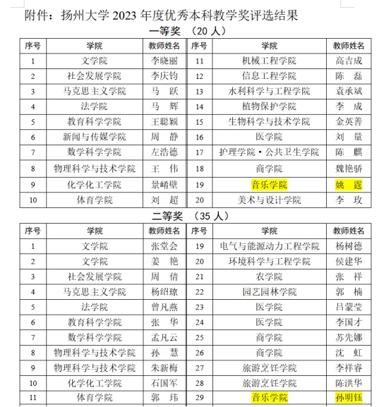近日,学校公布2023年优秀本科教学奖评选结果,我院姚霆老师荣获一等奖,孙明钰老师荣获二等奖。