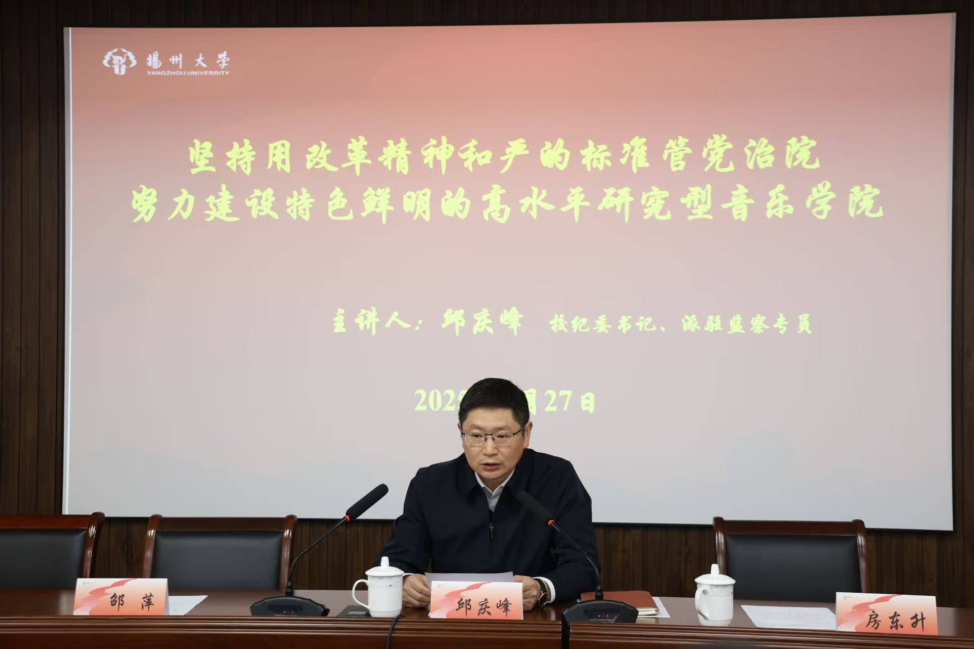 3月27日下午,学院在美学堂召开2025年全面从严治党暨校园安全综合治理工作会议,校纪委书记、派驻监察专员邱庆峰莅临指导并作全面从严治党专题报告,会议由学院党委副书记、纪检委员吴伟主持。学院全体教职工、学生党员代表参加了会议。