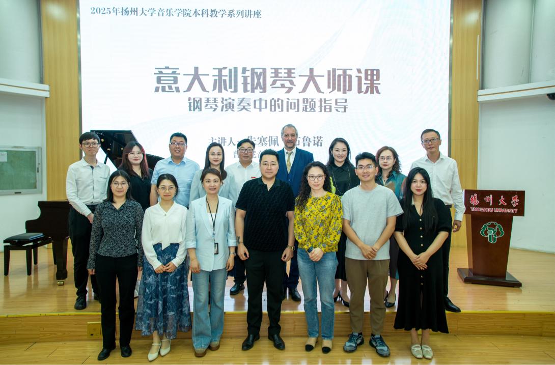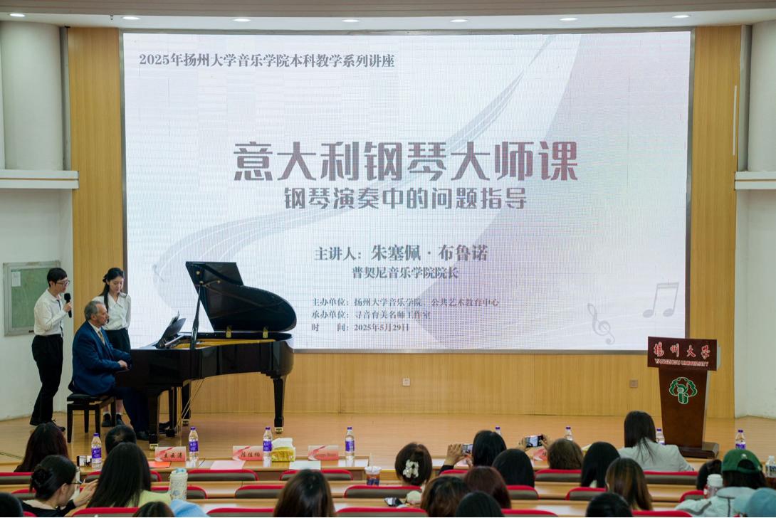 为全面提升学生专业素养,2025年5月29日下午,扬州大学音乐学院开展本科教学系列讲座钢琴大师课——钢琴演奏中的问题指导。本次钢琴大师课特邀意大利著名钢琴家朱塞佩·布鲁诺教授(Prof. Giuseppe Bruno)主讲,学院党政领导班子全体成员、钢琴教研室全体教师以及学院大一至大三学生、钢琴专业全体学生参加了本次讲座。