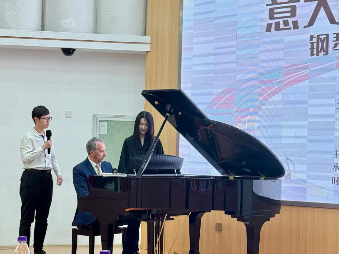 本次讲座分为三个部分,首先是普契尼音乐学院院长朱塞佩·布鲁诺教授钢琴独奏,教授通过细腻的音色处理和富有张力的情感表达,带领观众领略了作品中的艺术魅力。