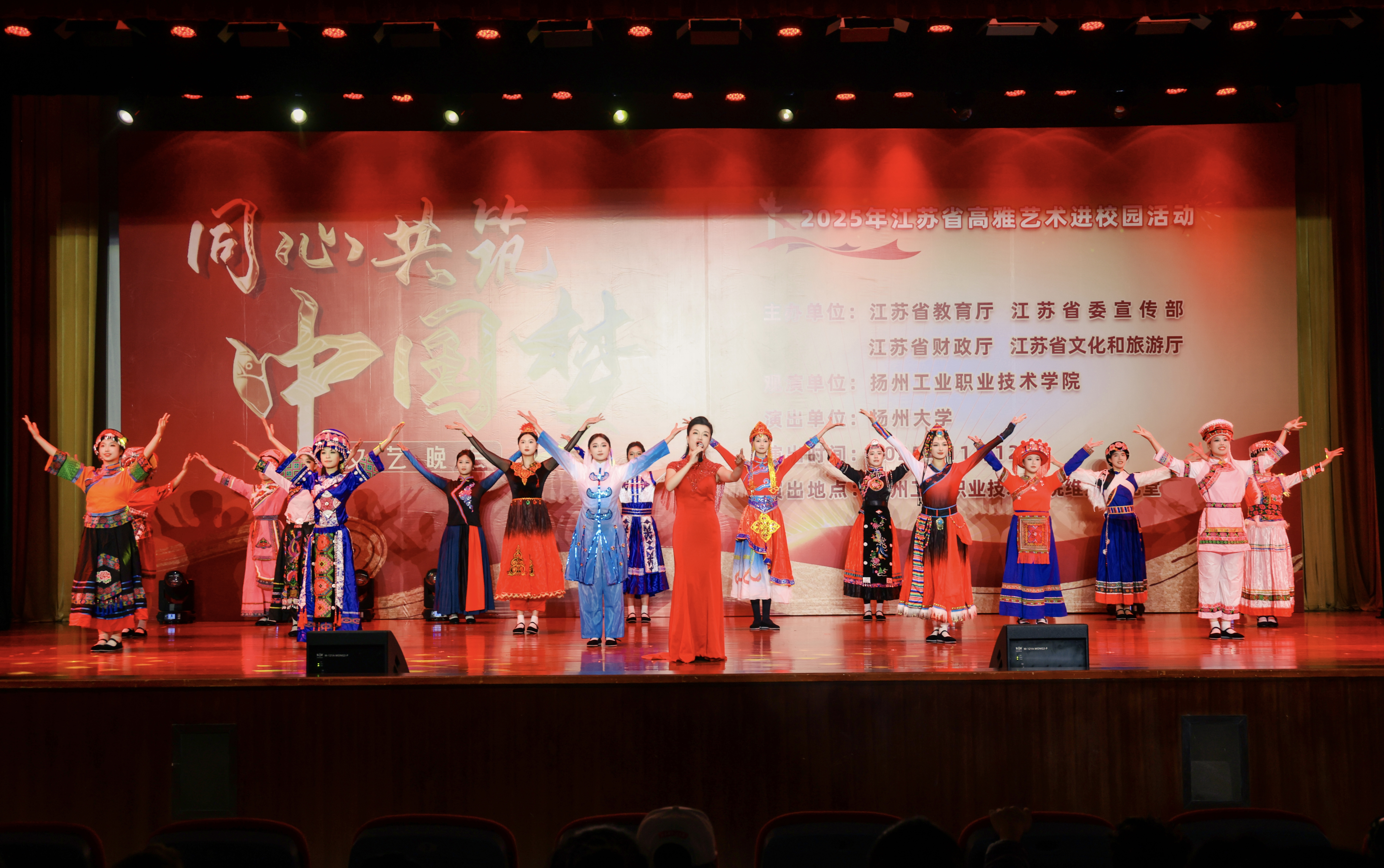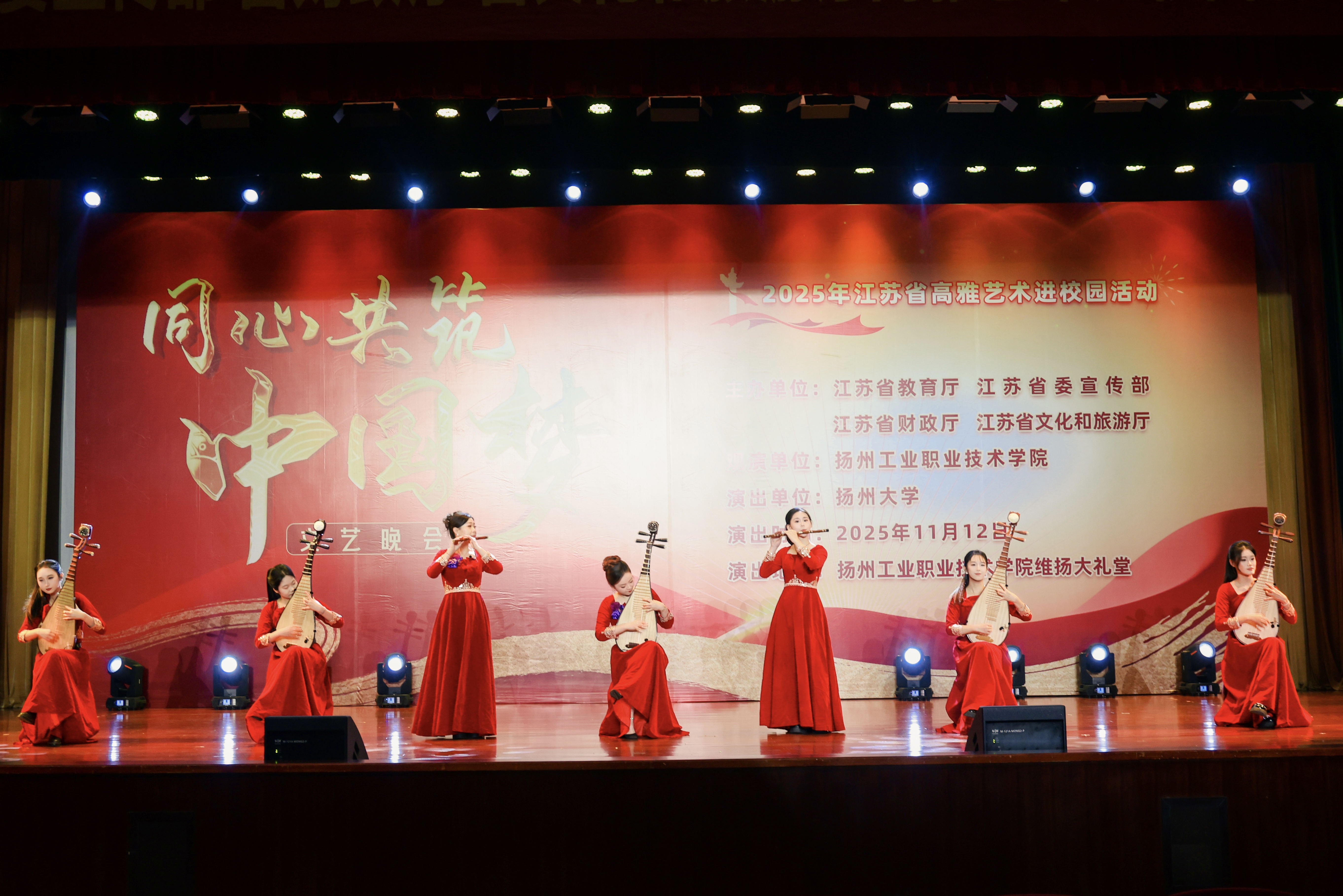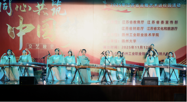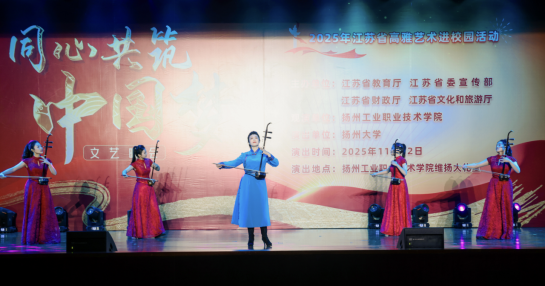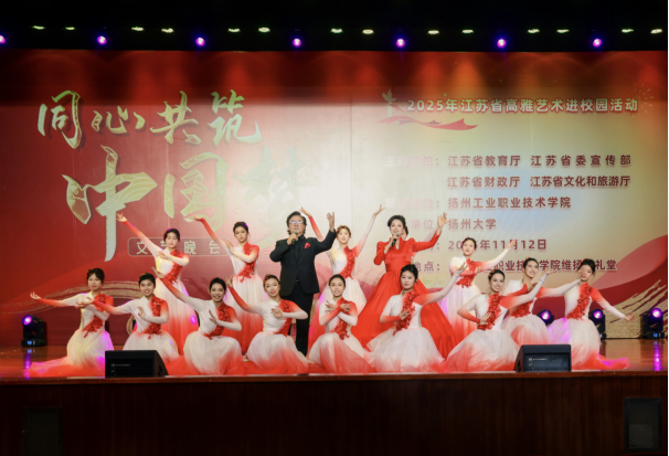 2025年11月12日晚,一场由江苏省教育厅、江苏省委宣传部、江苏省财政厅、江苏省文化和旅游厅主办,扬州大学作为演出单位的“高雅艺术进校园”动,来到了扬州工业职业技术学院。本场演出融合了民族风情、红色记忆与时代精神,以“同心共筑中国梦”为主题,在扬州大学音乐学院师生团队携精心编排的节目中,让高雅艺术之花在校园绚丽绽放。